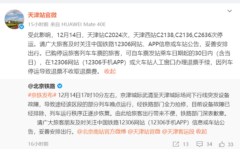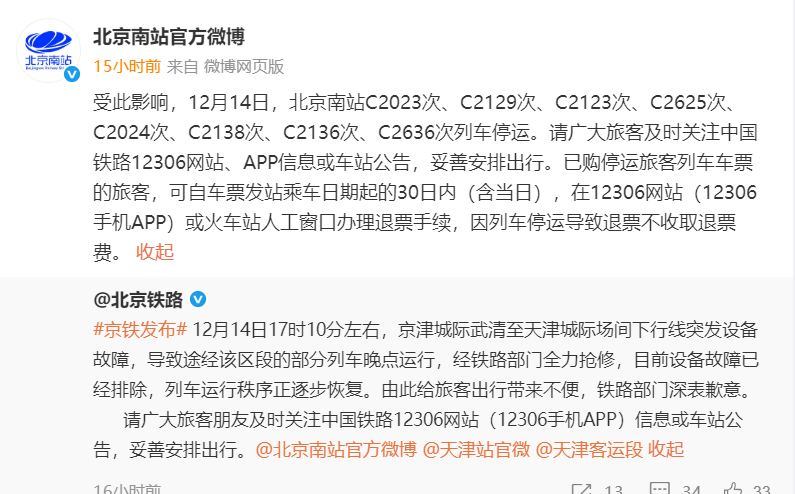 随后,天津火车站官方微博@天津站官微、中国铁路北京局集团有限公司北京南站官方微博@北京南站官方微博 发布消息称: