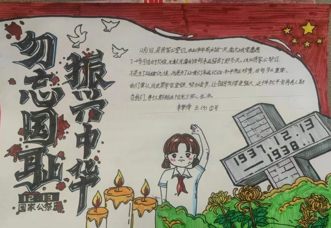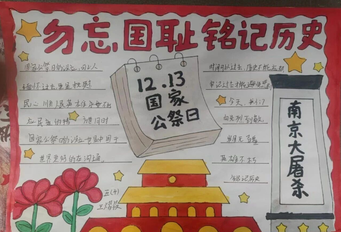 腾飞中队队员们以笔为剑、以纸为盾,用主题手抄报展现历史记忆与和平愿景,深切缅怀惨遭侵华日军屠杀的遇难同胞,铭记历史哀痛,激发爱国热情。