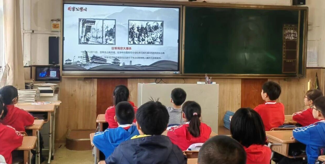 五年级四班腾飞中队主题班会上,师生们集体观看了南京大屠杀纪录片,班主任利用图片和视频资料,带领队员们回溯那段山河破碎、生灵涂炭的惨痛历史,揭露南京大屠杀历史事实,讲述中国人民在抗日战争中展现出的英勇抗战、不屈不挠的伟大精神,引导队员们捍卫历史真相、珍惜和平生活,以实际行动肩负起新时代青少年的使命担当。李章博同学分享了心得体会。