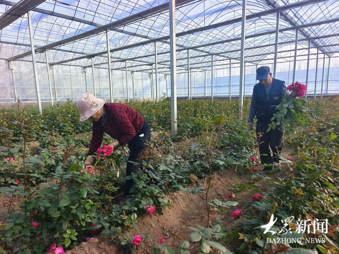 许家湖镇严家官庄村花卉大棚里,村民们正在采摘玫瑰花。