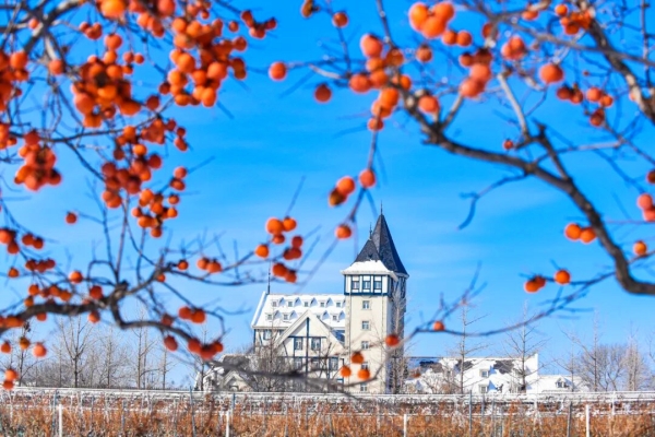Red persimmons hang like lanterns from the branches at Chateau Changyu-Castel. [Photo/WeChat account: ytkfqfb]