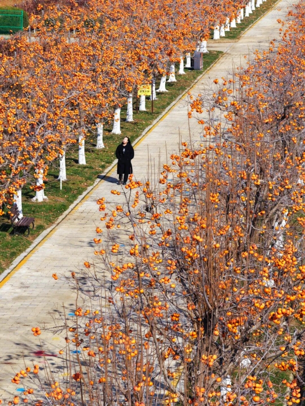 Persimmon trees stand in orderly rows along both sides of the road, forming a bright and picturesque scene. [Photo/WeChat account: ytkfqfb]