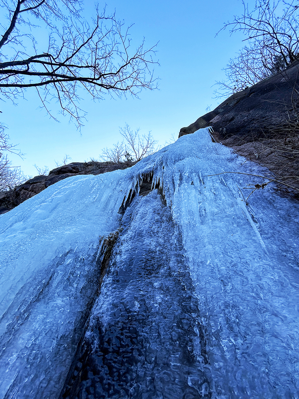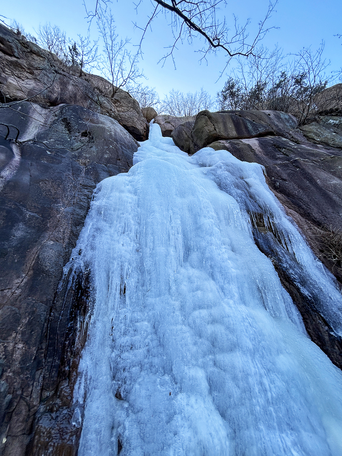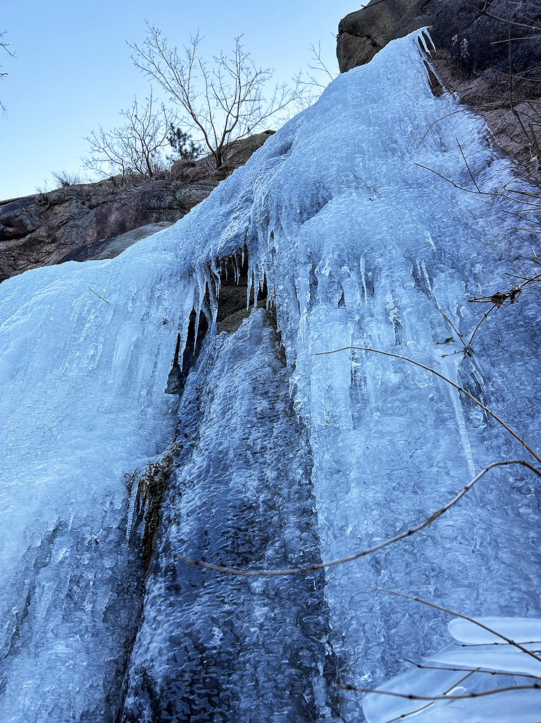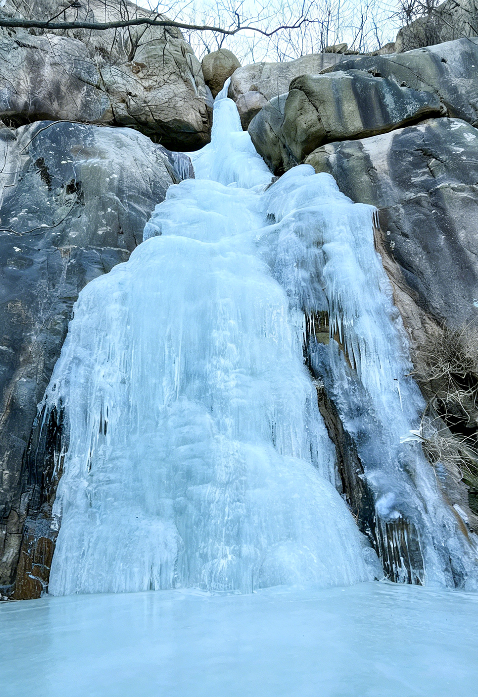 在山东省青岛市城阳区夏庄街道隐藏着一处冬日里的自然奇观天落水瀑布严冬时节瀑布水流经冷空气洗礼后凝结成壮观的冰瀑悬挂在岩石之上冰柱晶莹剔透形态各异宛如大自然的雕塑作品将冬日的静谧与壮美展现得淋漓尽致青岛市即墨区孙友军拍摄