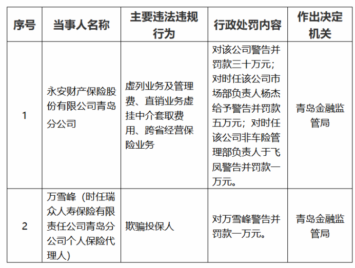 12月11日,国家金融监督管理总局青岛监管局披露的行政处罚决定书显示,永安财险青岛分公司因虚列业务及管理费、直销业务虚挂中介套取费用、跨省经营保险业务,被国家金融监督管理总局青岛监管局警告并罚款30万元。同时,时任该公司市场部负责人杨杰被警告并罚款5万元;时任该公司非车险管理部负责人于飞凤警告并罚款1万元。