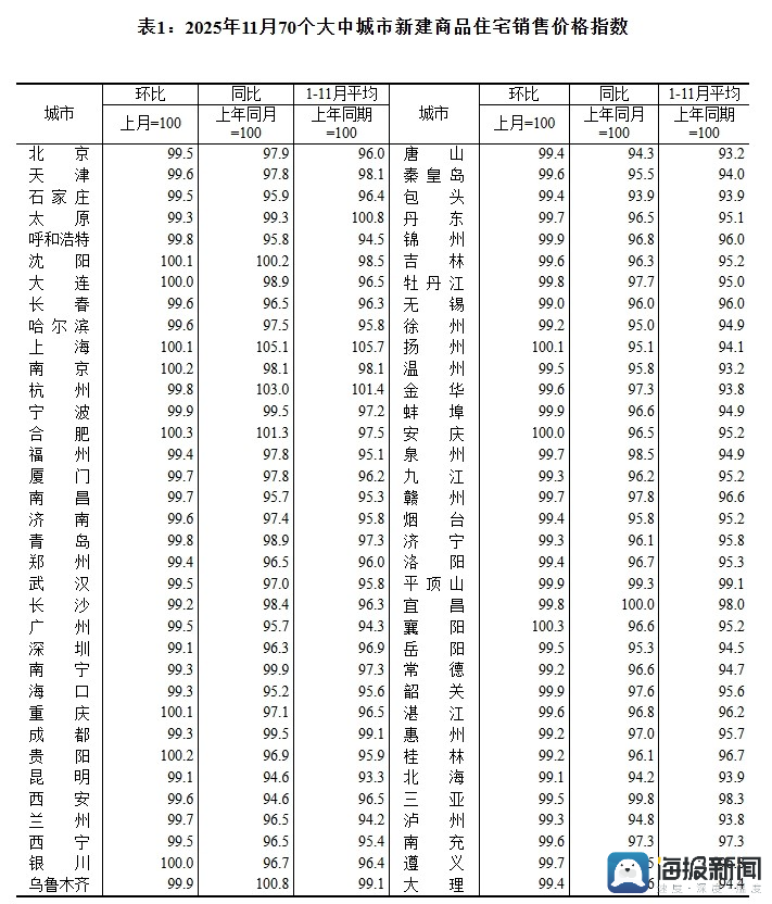表1:2025年11月70个大中城市新建商品住宅销售价格指数