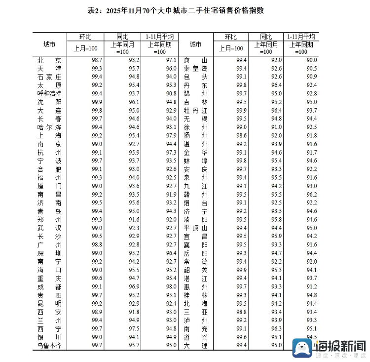 表2:2025年11月70个大中城市二手住宅销售价格指数