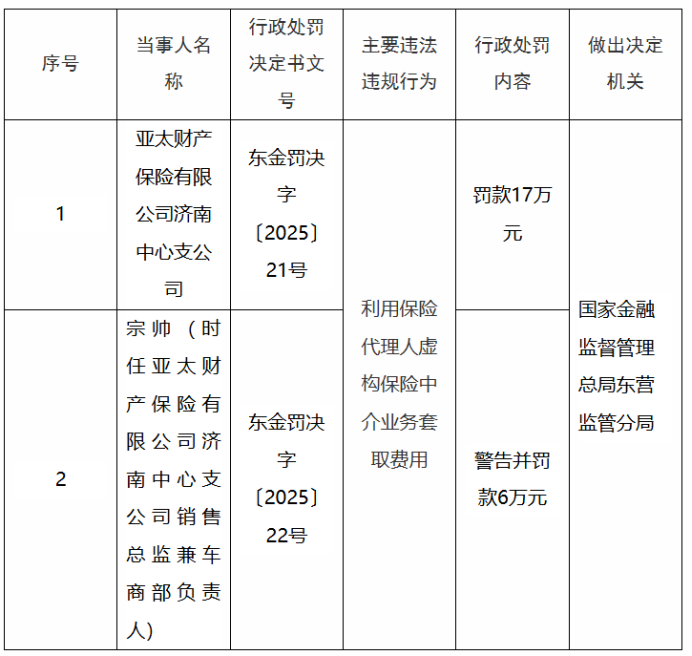 12月10日,国家金融监督管理总局山东监管局官网公示的行政处罚决定书显示,亚太财产保险有限公司济南中心支公司因利用保险代理人虚构保险中介业务套取费用被罚款17万元。同时,宗帅(时任亚太财产保险有限公司济南中心支公司销售总监兼车商部负责人)被警告并罚款6万元。