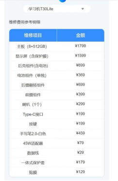以刘女士购买的科大讯飞学习机T30Lite为例,质保期外售后维修费用的收费标准为:主板维修金额1799元,显示屏维修金额1599元,后壳组件维修金额699元,后摄反转组件699元。