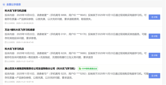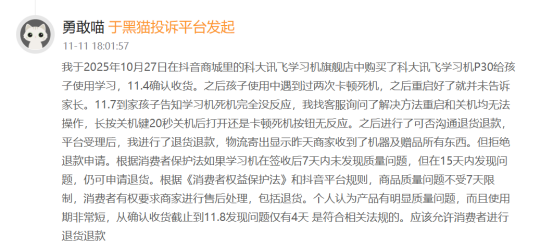 消费者投诉平台“黑猫投诉”上,关于科大讯飞的投诉有1700多条,其中和科大讯飞学习机直接相关的就有近400条。投诉描述包括“卡顿死机”“作业误判”“屏幕变形”等。