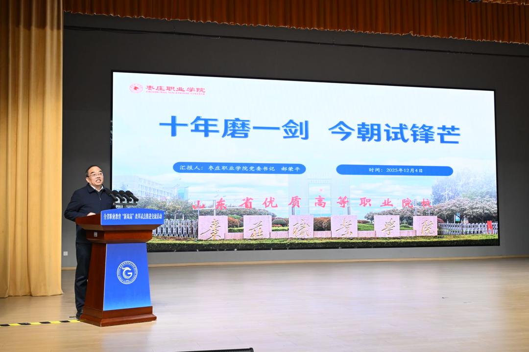 12月4日,在全省职业教育“新双高”改革试点推进交流活动会议上,枣庄职业学院党委书记郝荣平以《十年磨一剑 今朝试锋芒》为题,作职业技能大赛典型发言。