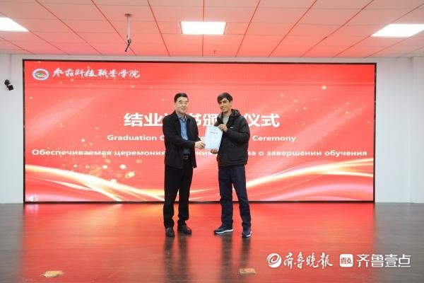 12月12日上午,枣庄科技职业学院在图书馆卓越匠心文化体验中心举行2025届留学生结业仪式,热烈欢送塔吉克斯坦留学生顺利结业。学校党委副书记、院长闵祥寨,杭州电子科技大学原国际处处长、国际教育学院院长、港澳台主任田野教授、博士,学校党委委员、宣传部(信息处)部长马西柱,团委、学生工作处、教务处(科技处)、招生就业处主要负责人,文化与旅游学院班子成员参加仪式。任课教师参加仪式并为留学生送上诚挚的祝福,仪式由学校党委委员、副院长刘陵东主持。