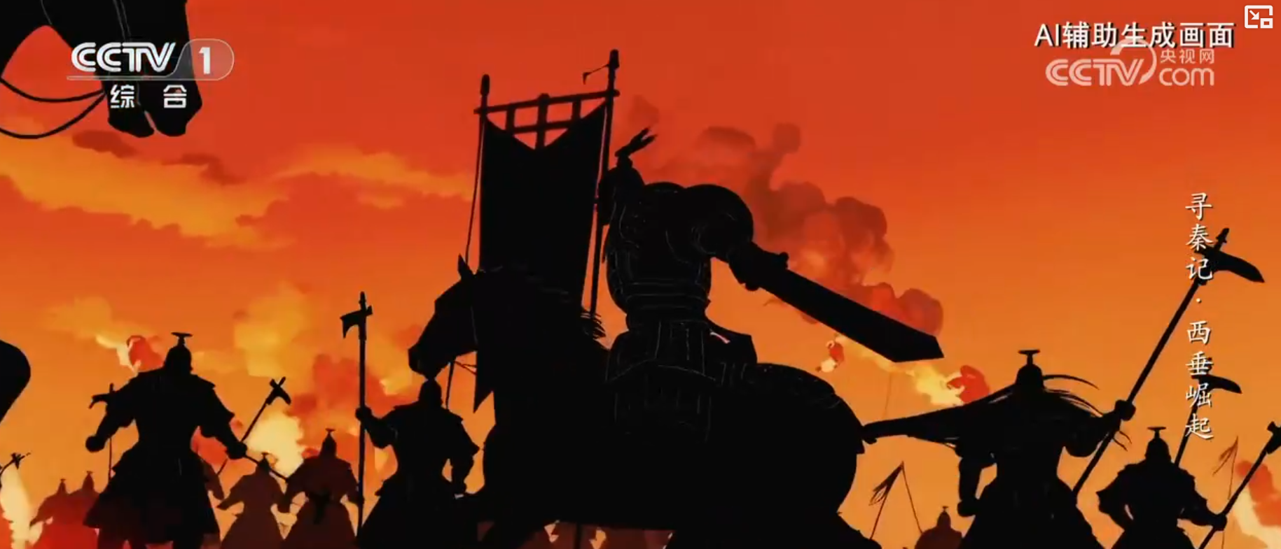 尤其引人注目的是AI技术的辅助运用。比如首集片尾一段:公元前770年,周平王在秦襄公护送下东迁洛邑,为酬谢护驾之功,周平王正式册封秦襄公为诸侯,并许以“戎无道,侵夺我岐、丰之地,秦能攻逐戎即有其地”的承诺。这段史实由AI还原,画面整体呈现赭红色,人物以黑色剪影形象出现,背景中战车滚滚、尘土飞扬,营造出古老而磅礴的视觉叙事,生动再现了当时的历史场景,使观众如临其境。
