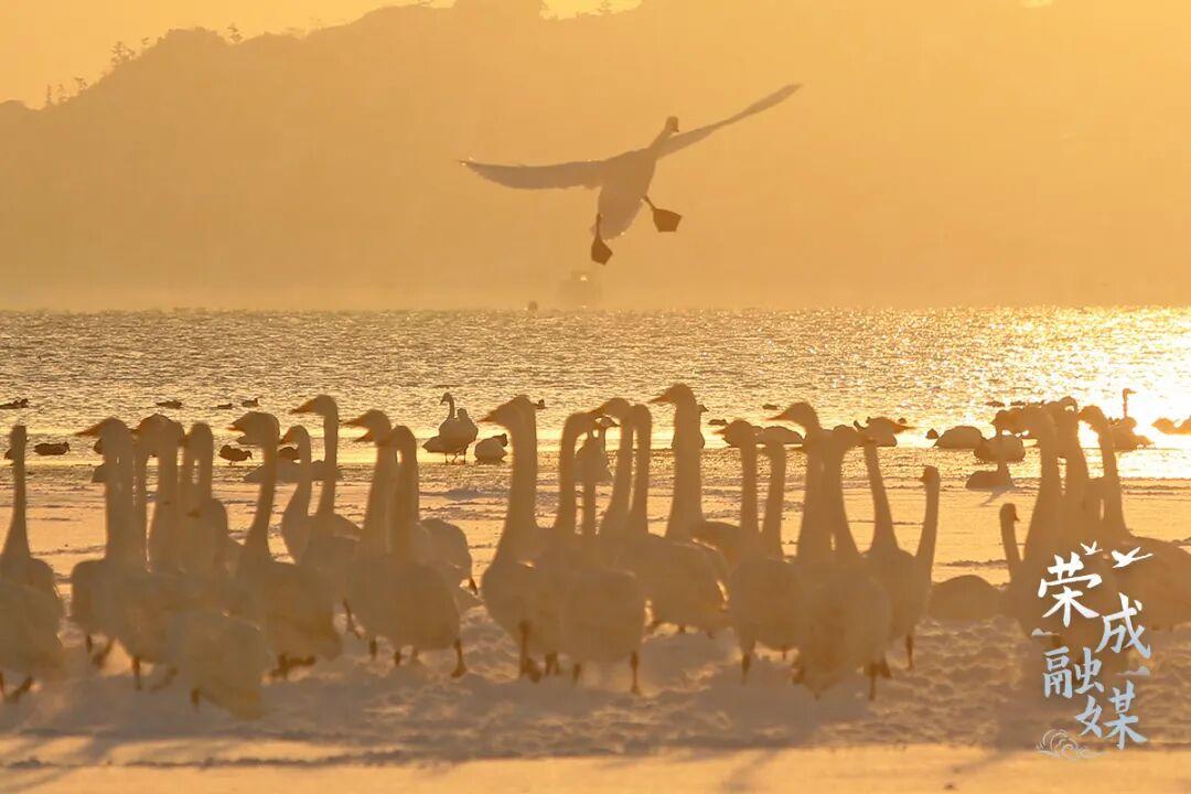 每年冬天,当寒风吹拂黄海之滨的荣成,一群来自西伯利亚的“白色精灵”——大天鹅便如约而至,它们优雅地掠过海面,栖息在荣成的海湾湿地,为这座滨海小城披上一层梦幻的羽翼。