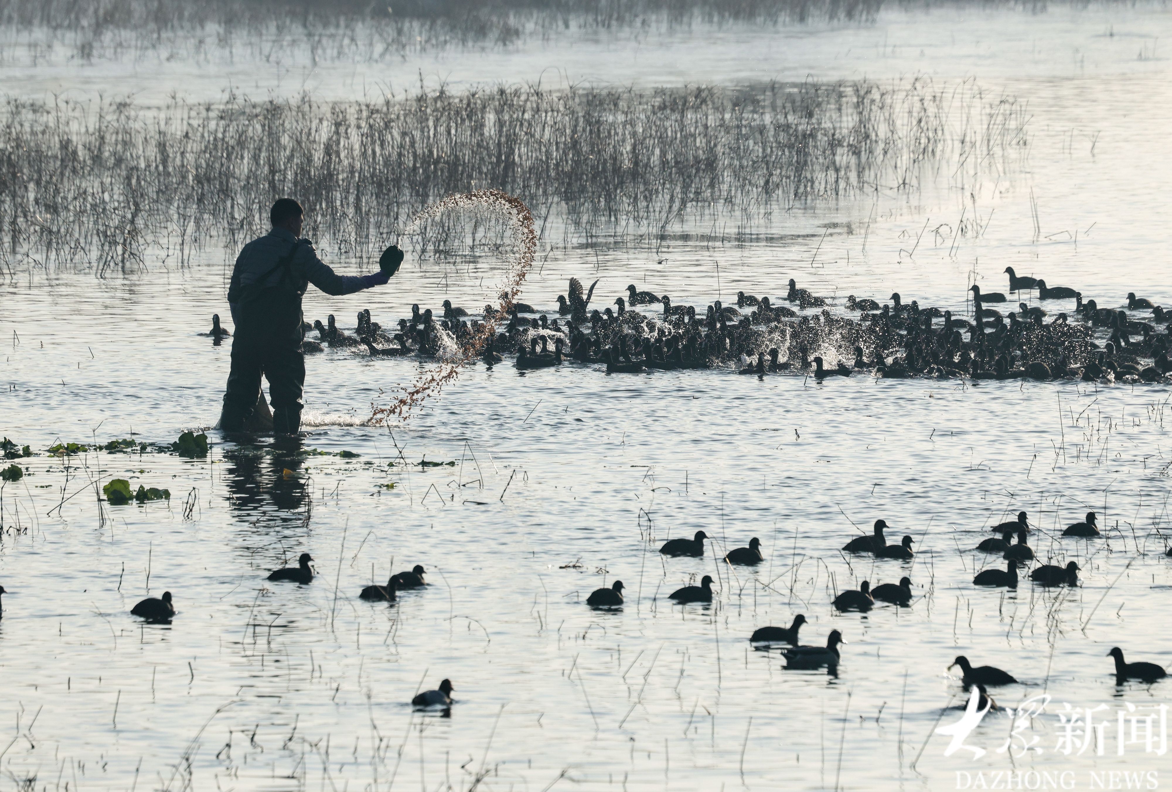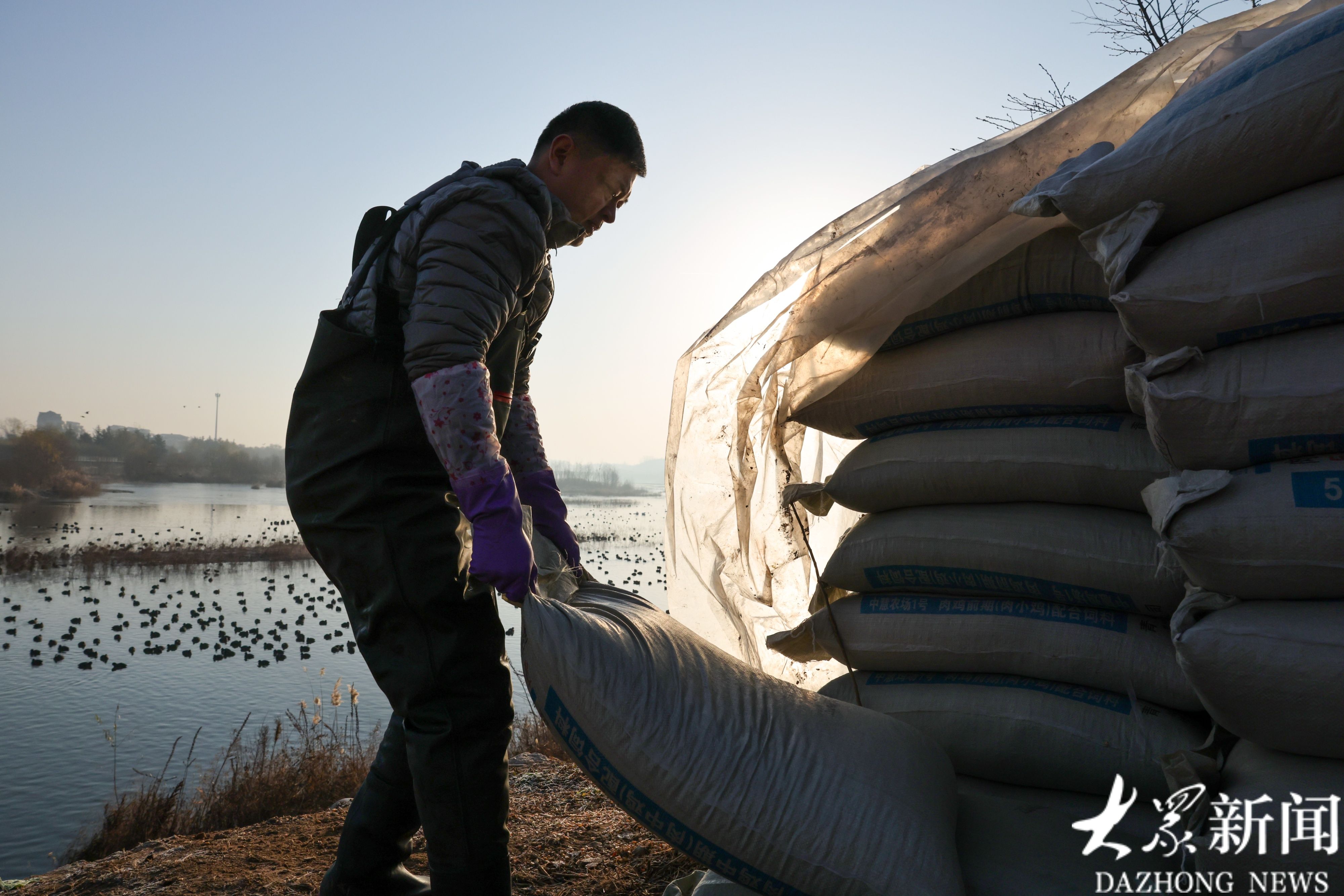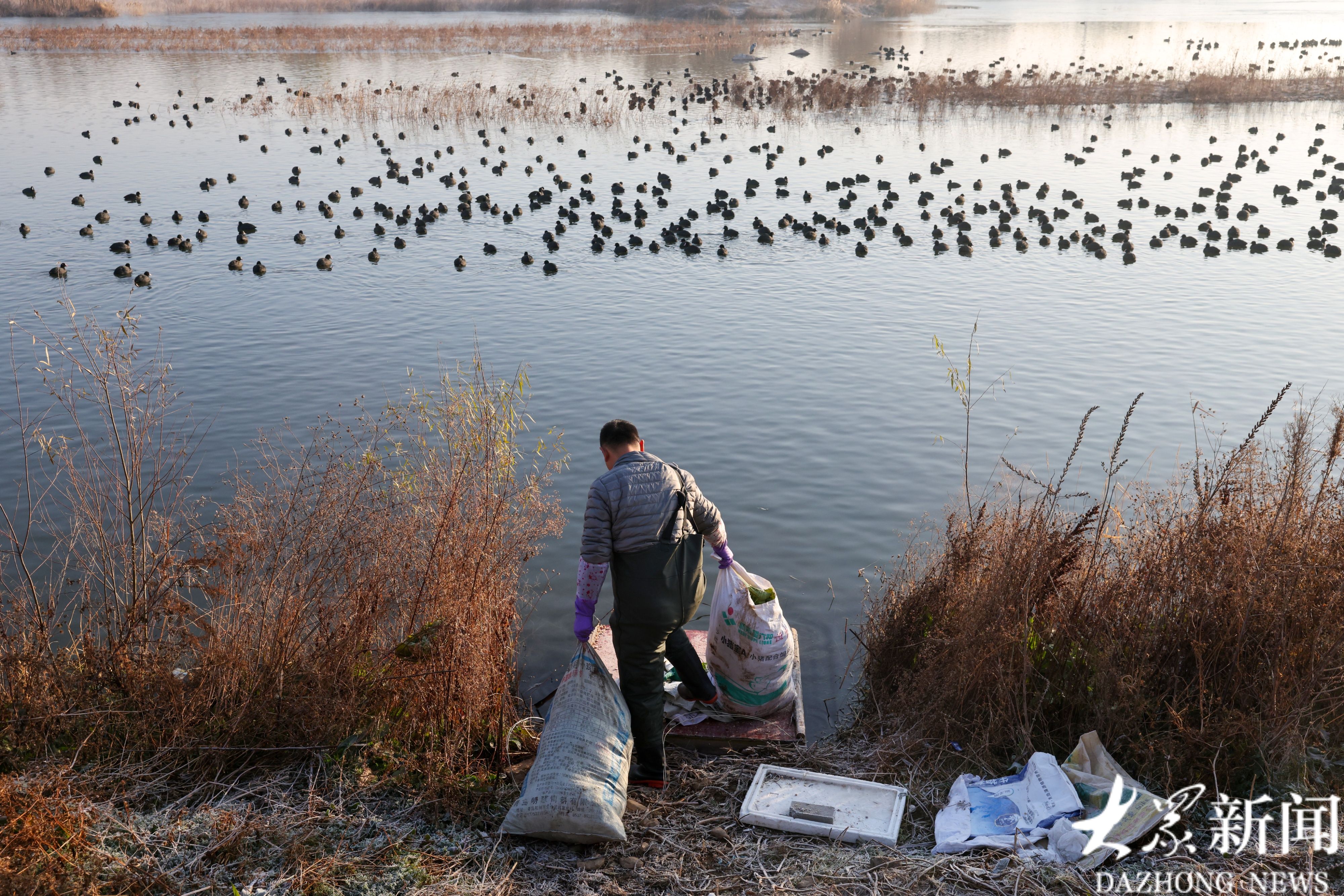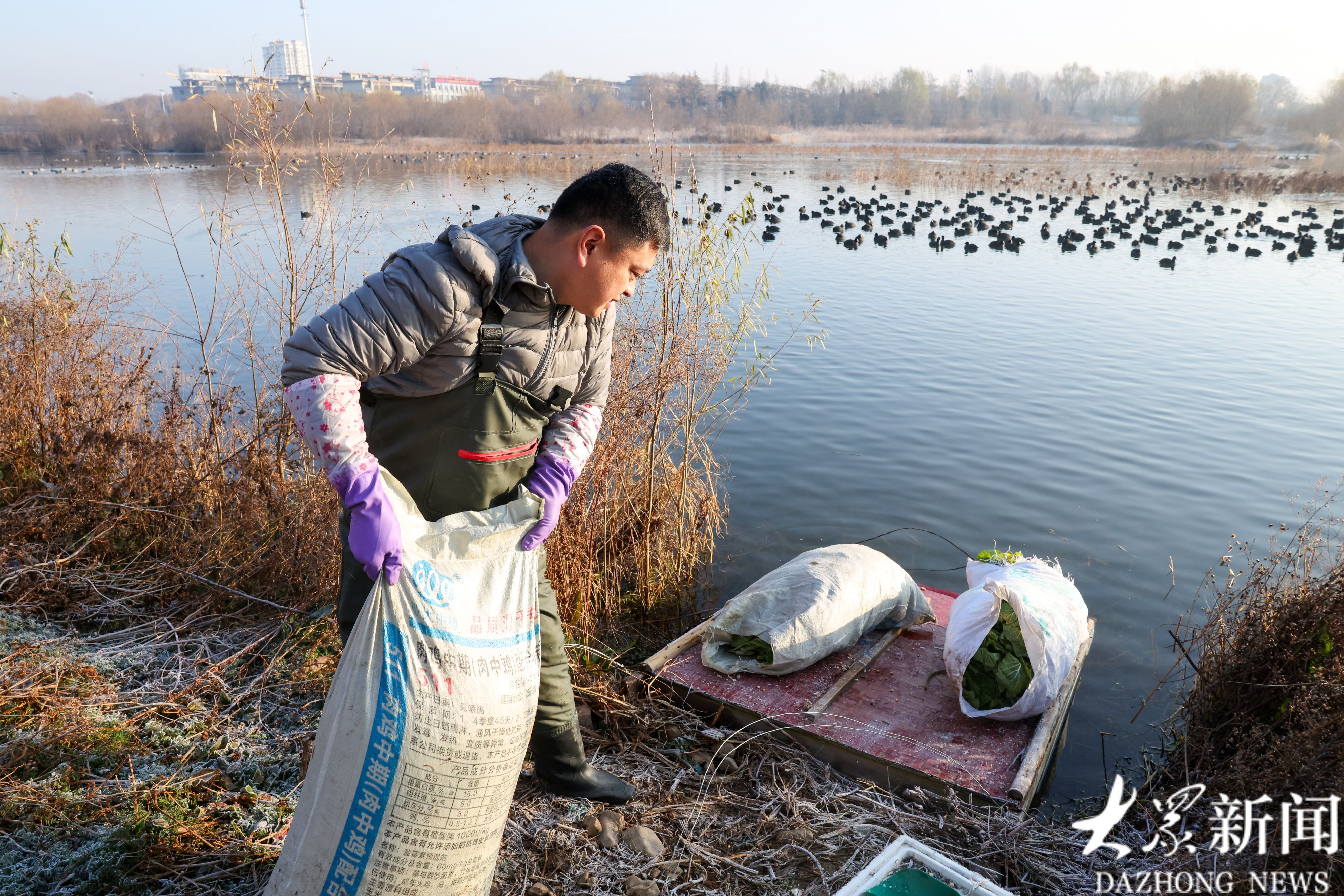 12月15日早晨8点,日照市五莲县白鹭湾湿地岸边,“天鹅守护者”刘明像往常一样,穿上厚重的皮裤,拉着两袋白菜和玉米,深一脚浅一脚地走进冰冷的河水中,开始了一天的投喂工作。