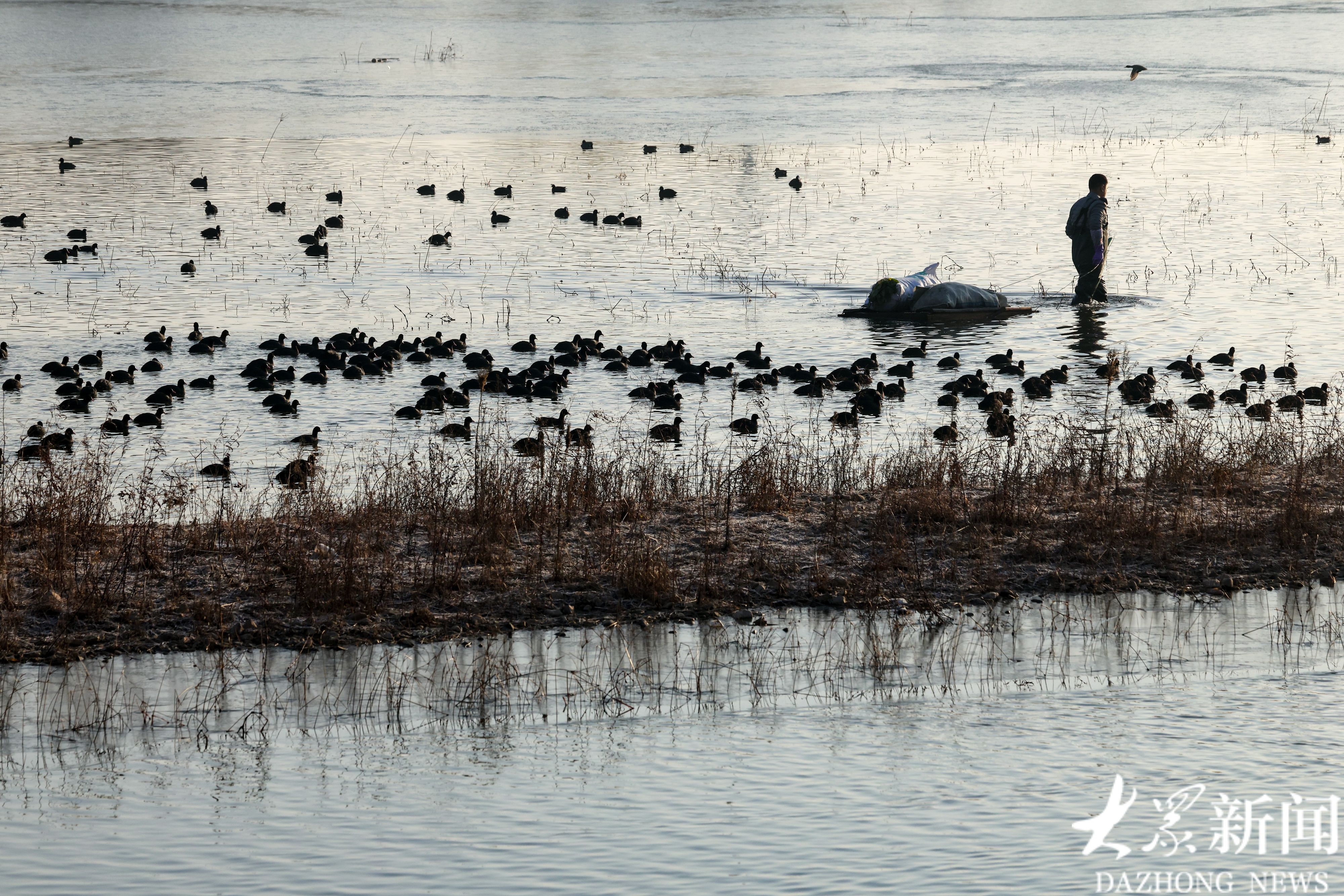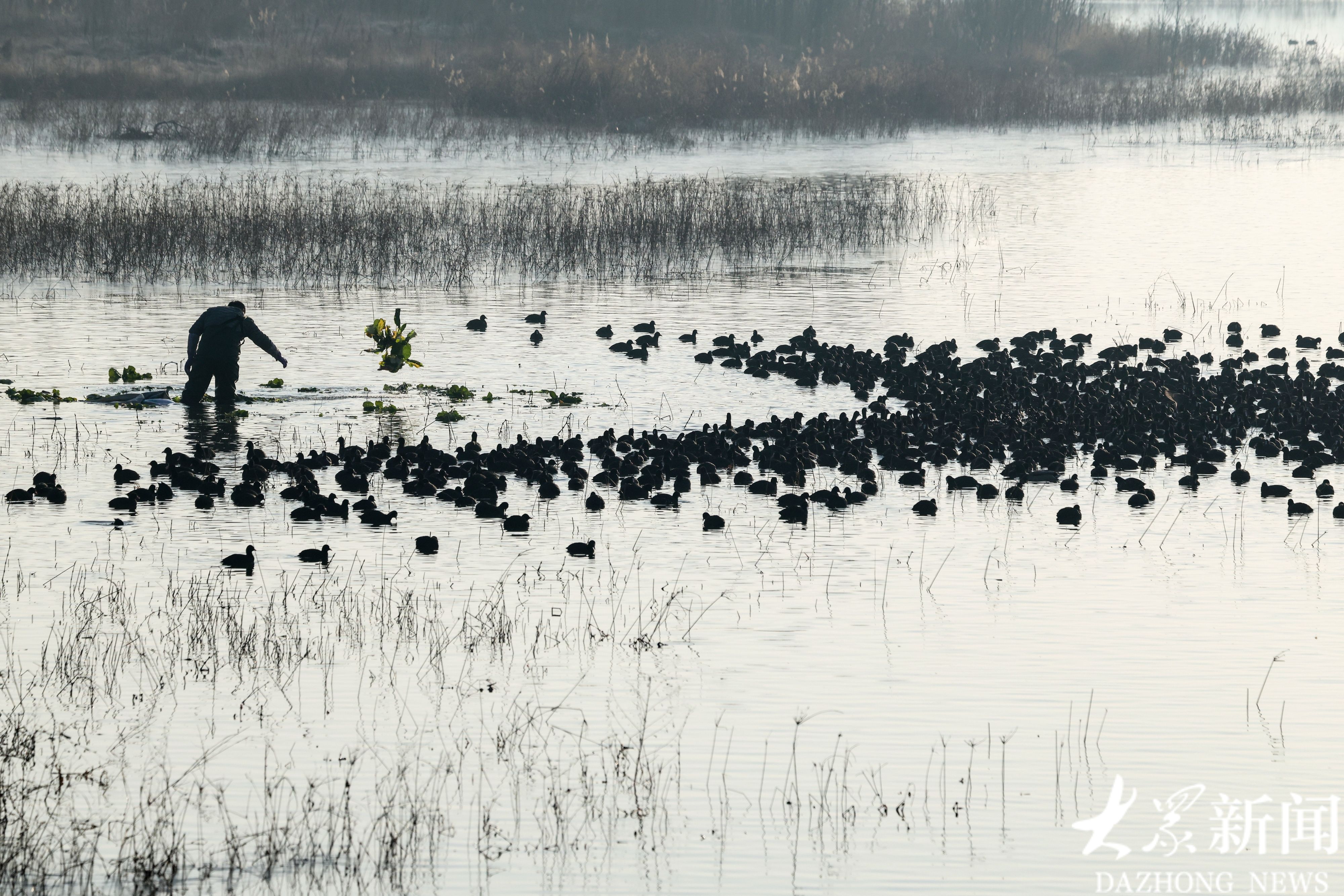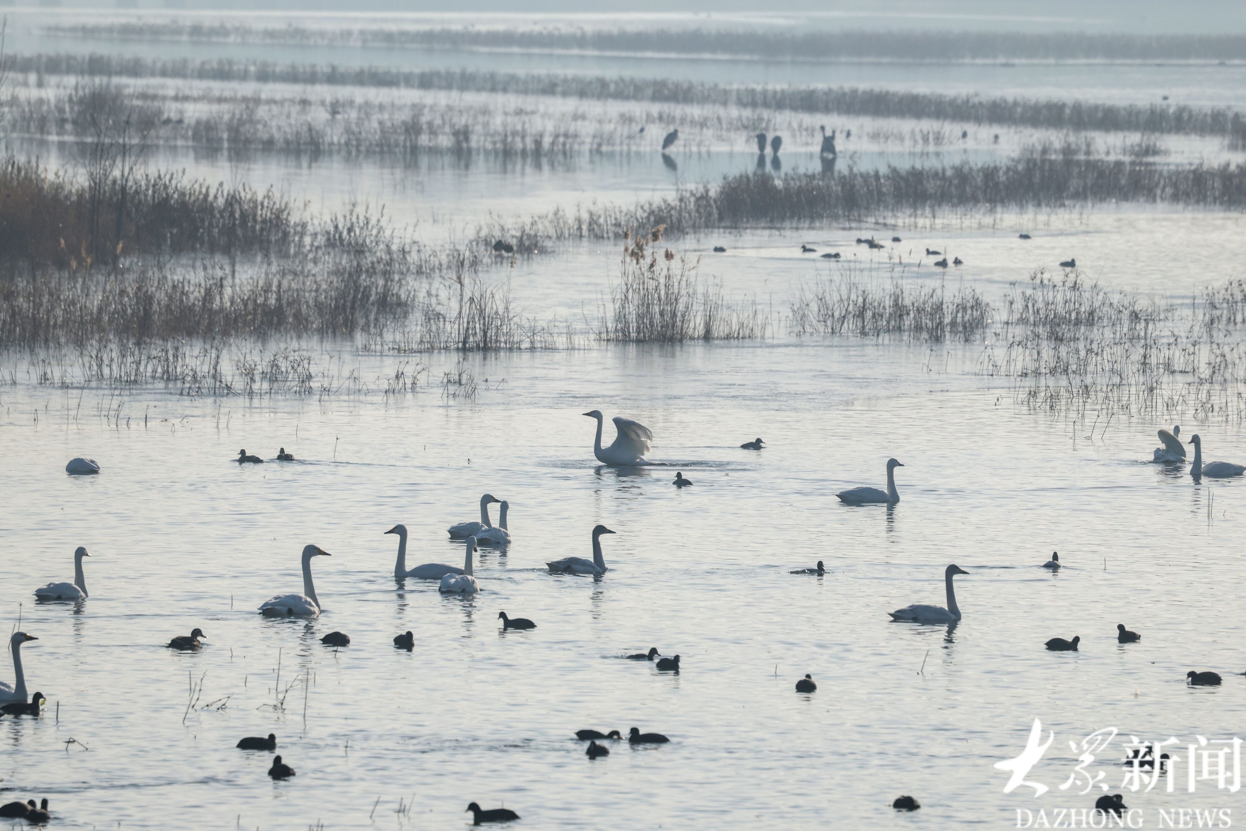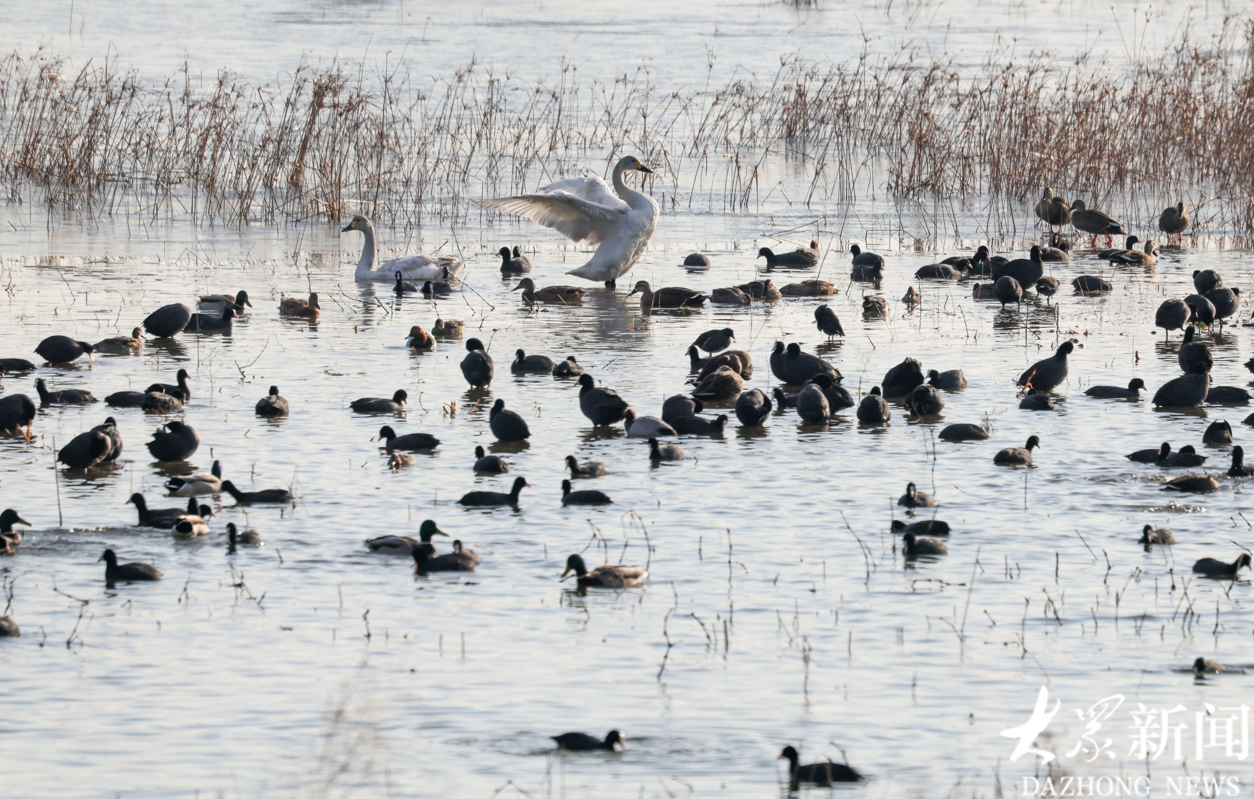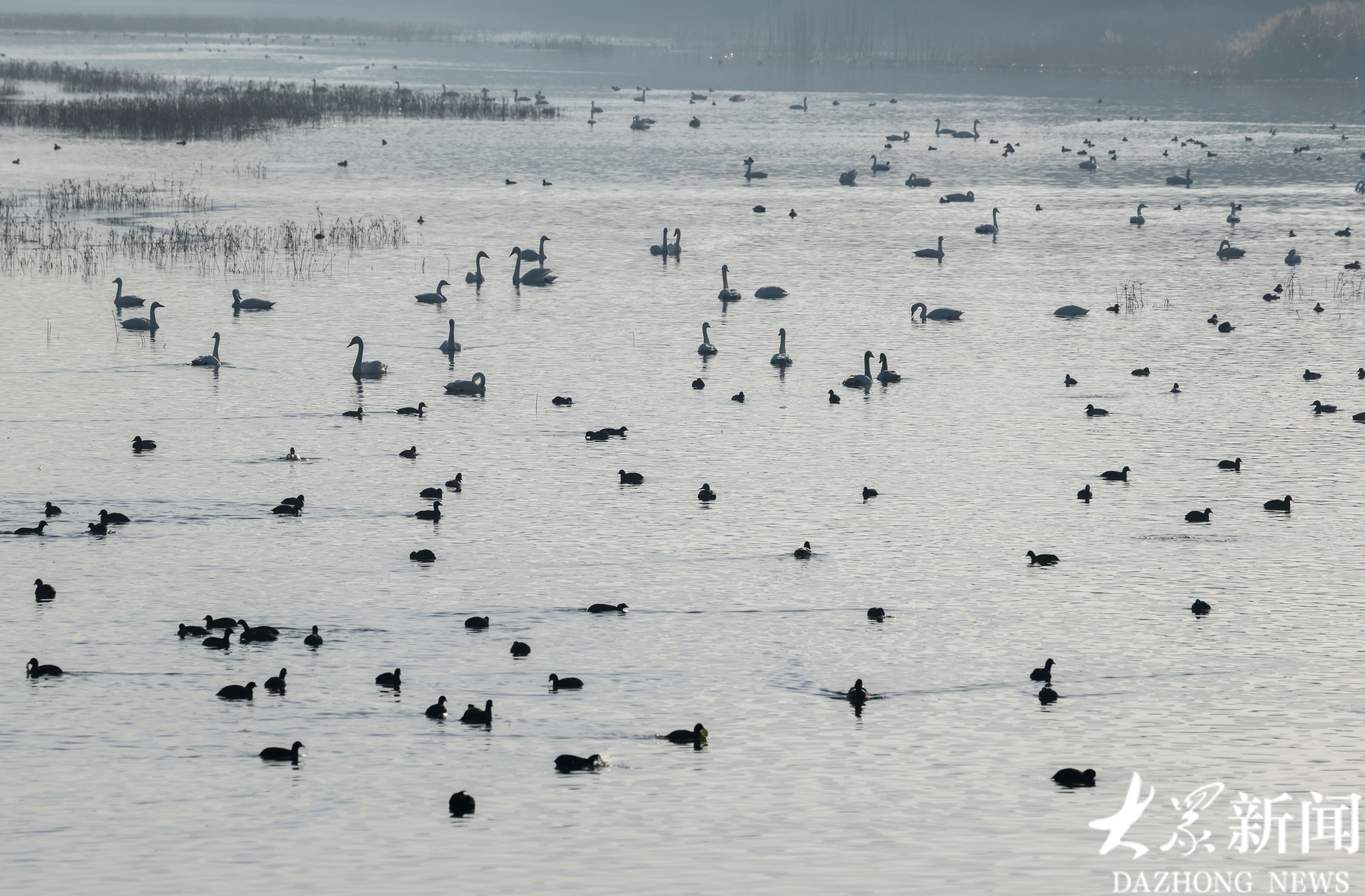 从每年11月初到来年2月中旬,守护这里的天鹅和水鸟,是刘明最重要的职责。“2014年刚来的时候,这里只有一只天鹅。如今,来这里越冬的大天鹅已经增加到了115只。”刘明指着水面介绍道,随着生态环境的改善,这里不仅留鸟多了,过客也多了。目前,常年在此越冬的鸟类有10多种,将这里作为迁徙点的鸟类更是超过80种,总数量突破1300只。