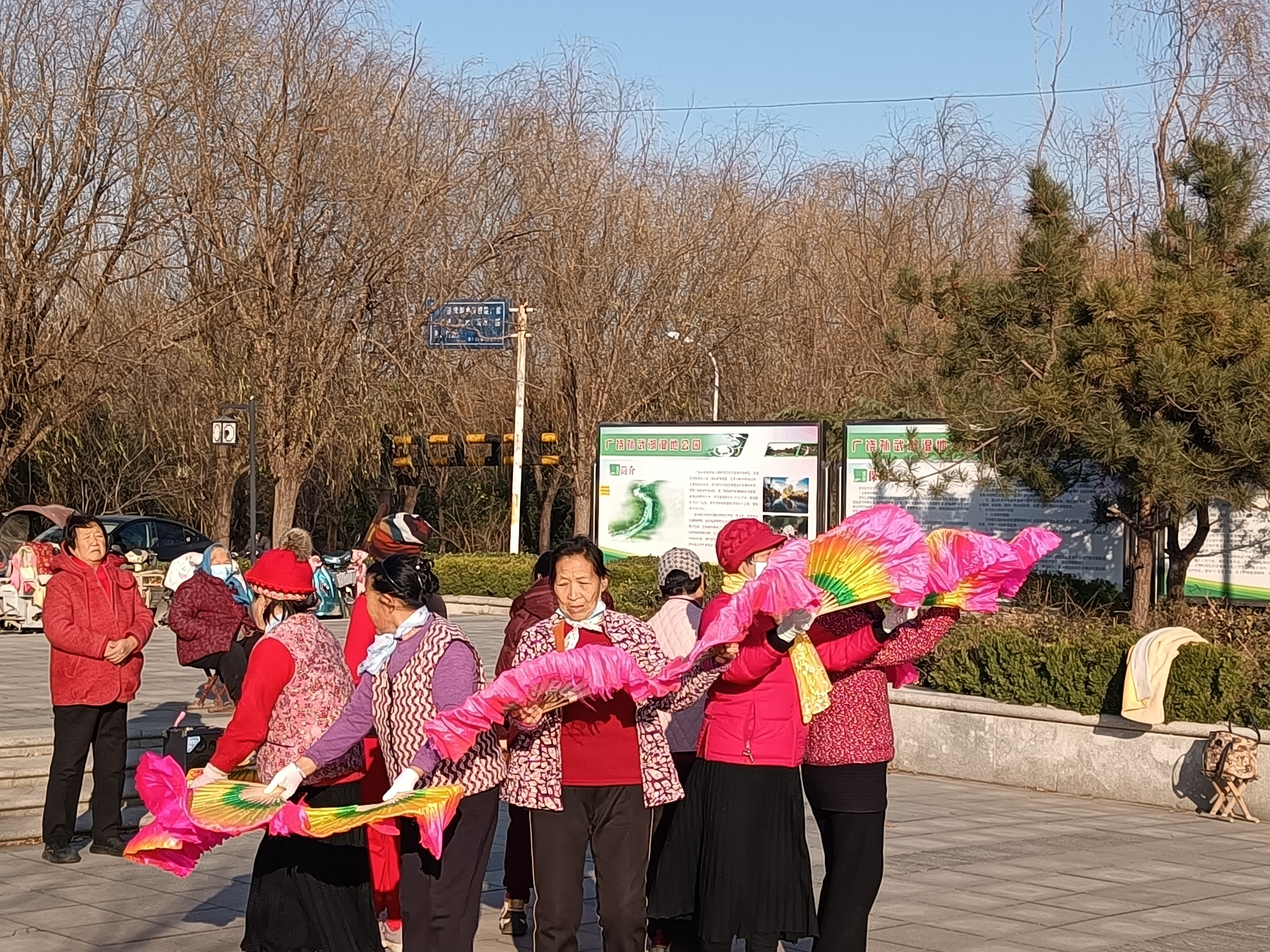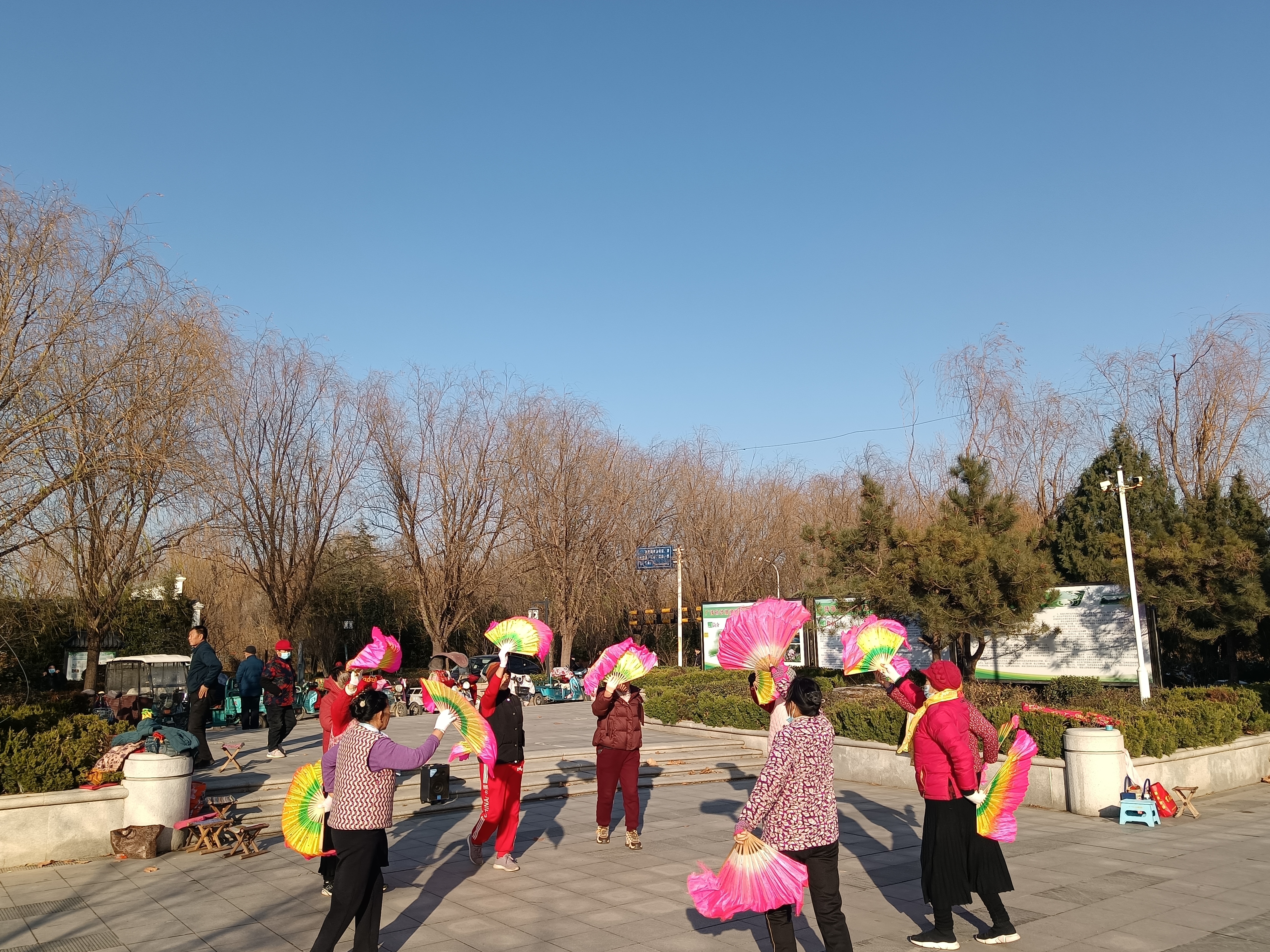 冬日的暖阳洒在广场上,几位阿姨们手持色彩明艳的绸扇,正抬手摆出整齐的造型。玫红的扇面张扬又热烈,扇沿的黄、绿渐变色彩像揉碎的霞光,和萧瑟的枯枝背景形成了鲜活的对比。她们穿着花色各异的厚外套,红的、粉的、花纹的布料交织在一起,带着浓浓的生活烟火气,抬手间的动作整齐划一,把冬日里的活力与喜庆揉进了这一方小天地,仿佛连凛冽的寒风都被这热闹的画面暖化了几分。