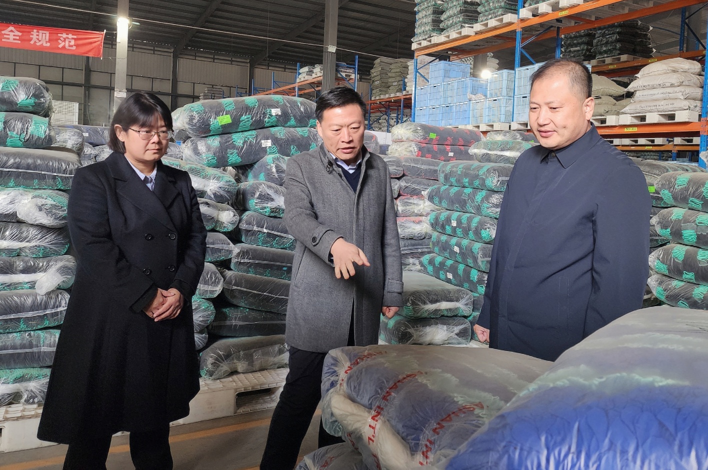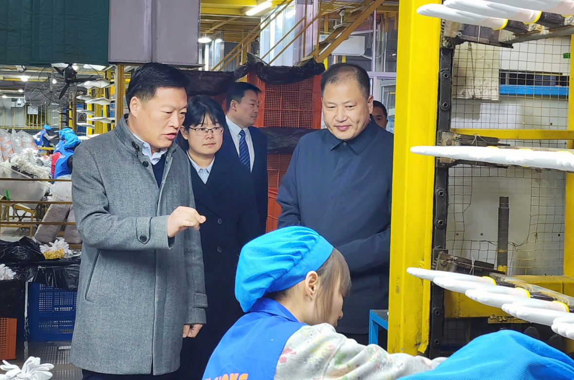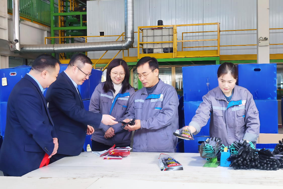山东恒得力手套有限公司负责人倪善峰(中)向仲村镇党委书记(右一)及平邑农商银行工作人员介绍企业生产及销售情况