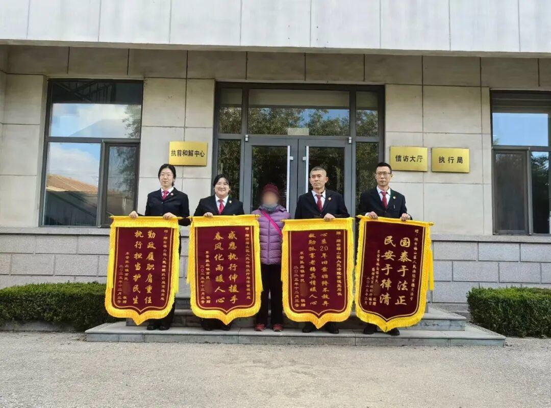 在烟台迎来初雪的日子,郭大姨拿着四面锦旗及感谢信来到了福山法院的大门前。