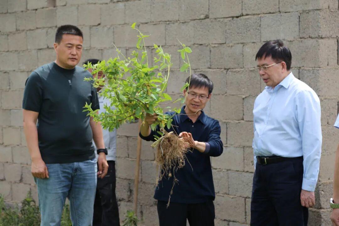 付晓向中国工程院院士刘良介绍平邑金银花种质种苗。