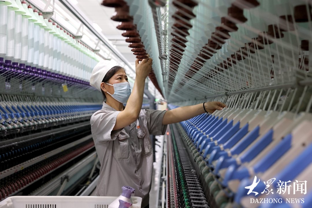 12月14日, 在枣庄经济开发区一家纺织企业,工人在智能化生产线上加工高端纺线。