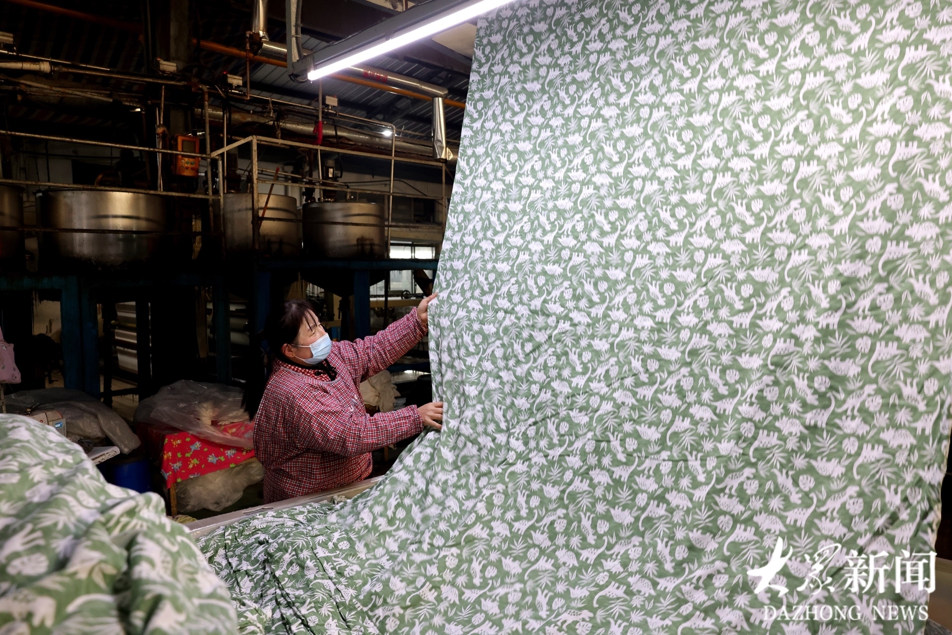 12月14日,在枣庄市市中区税郭纺织工业园一家企业,技术人员在智能印花生产线上查看产品质量。