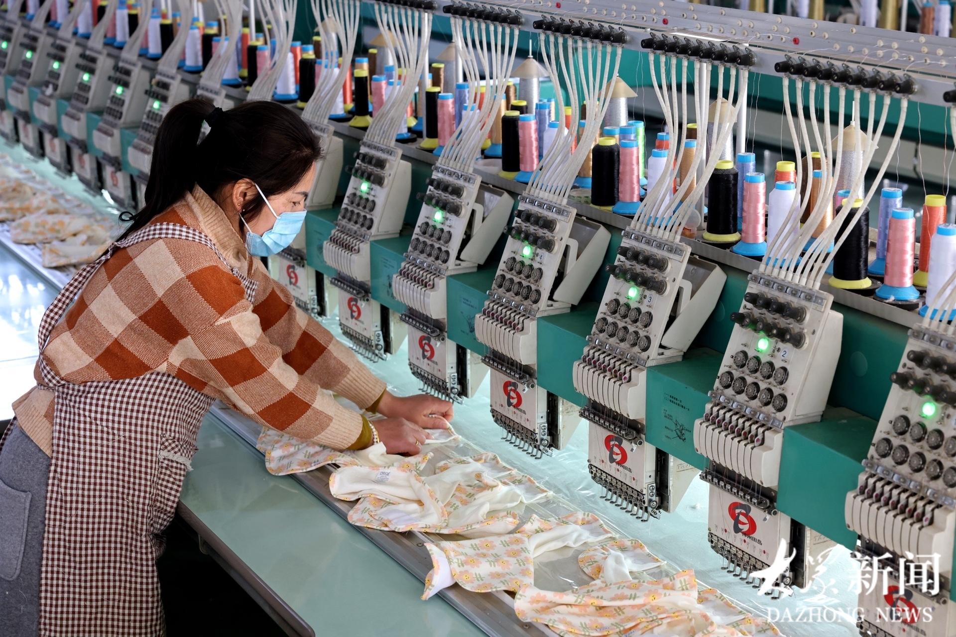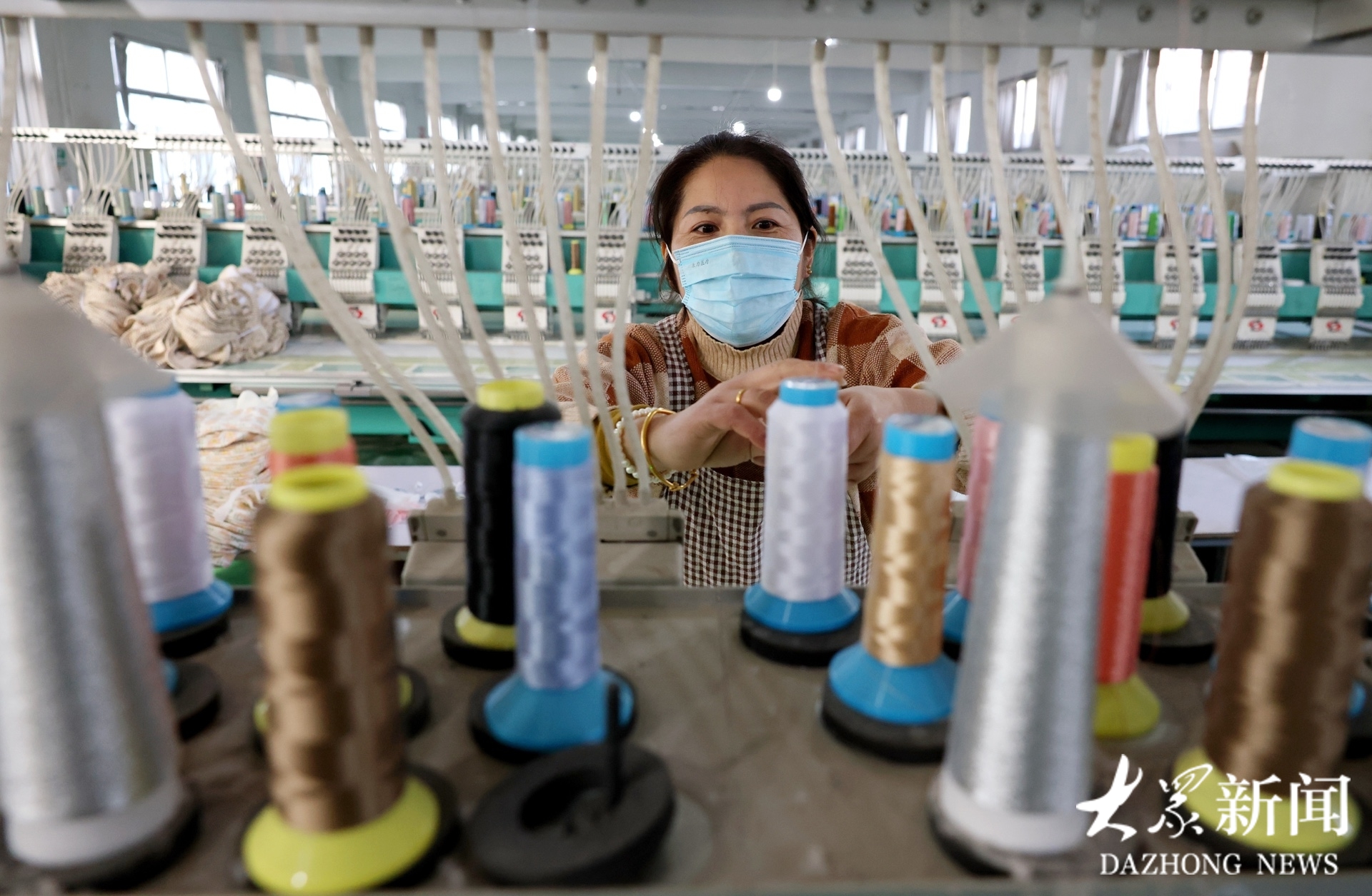 12月14日,枣庄世纪针纺有限公司,工人在绣花生产线上生产产品。
