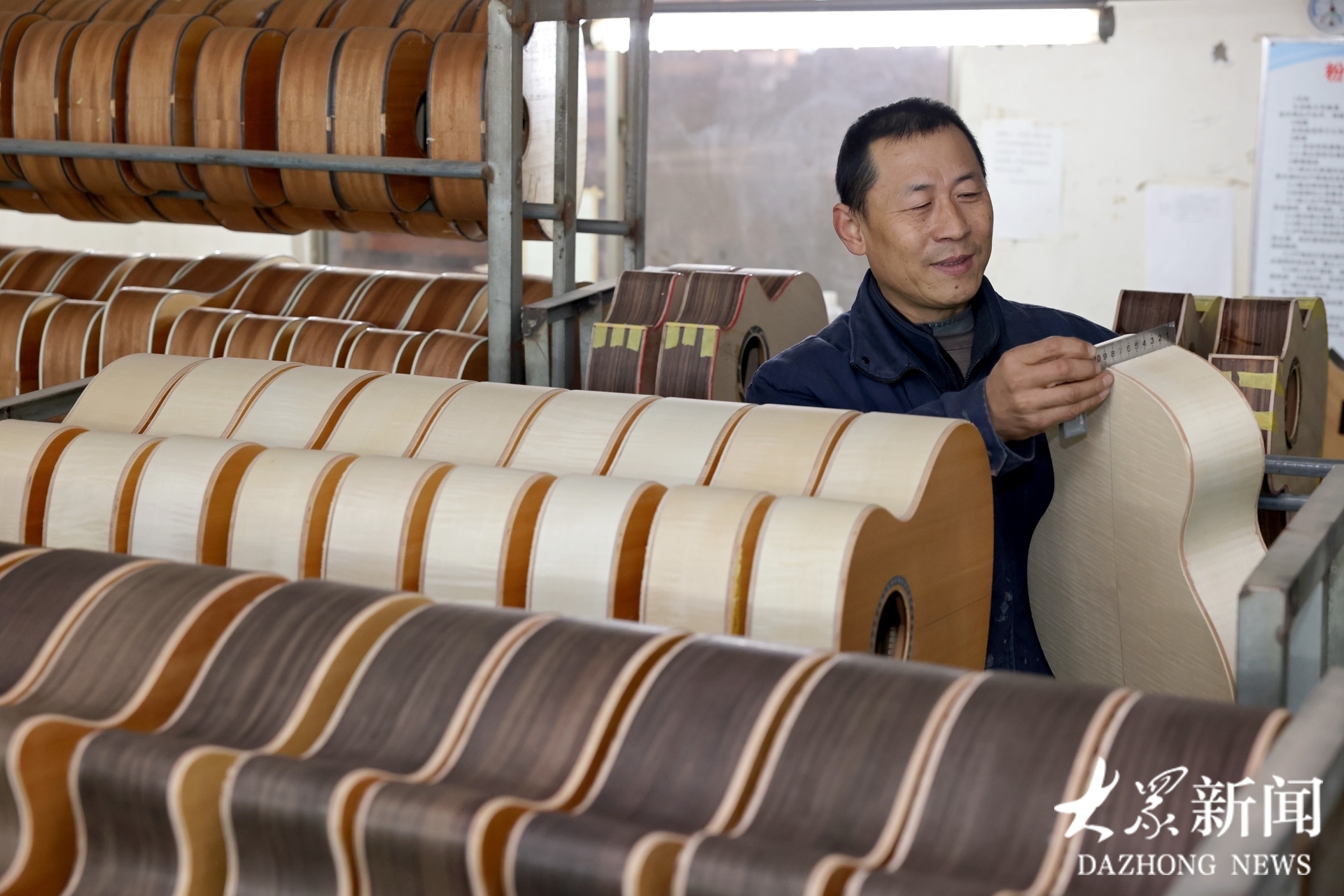 12月15日,在枣庄市市中区孟庄镇一家吉他生产企业,技术工人在生产吉他。