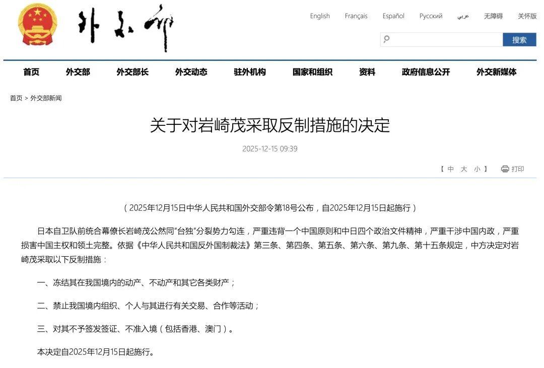 12月15日,外交部网站发布关于对岩崎茂采取反制措施的决定:关于对岩崎茂采取反制措施的决定