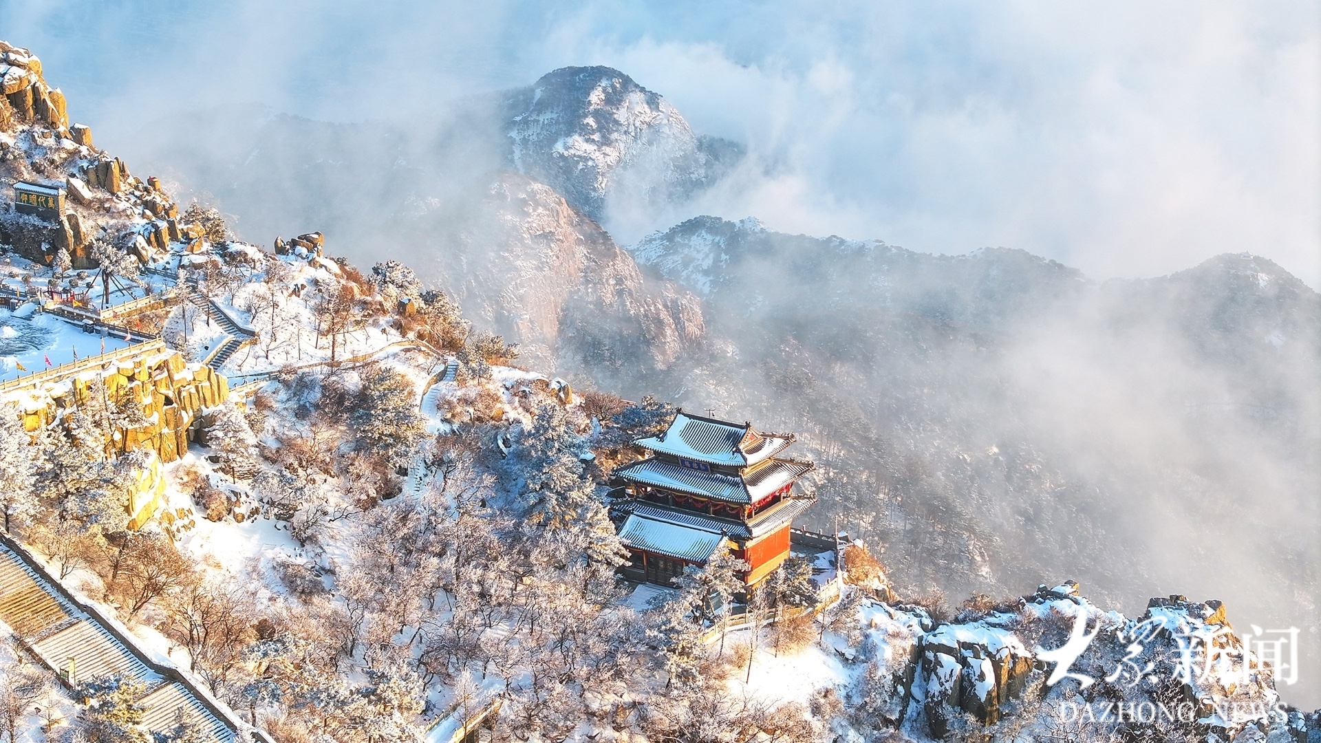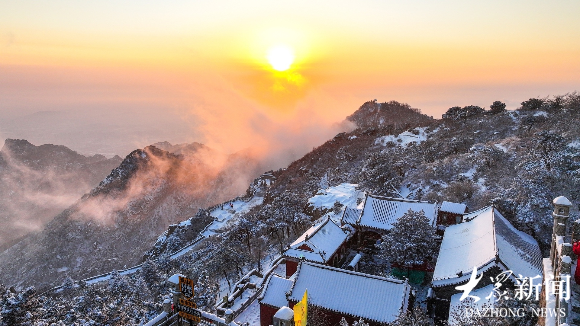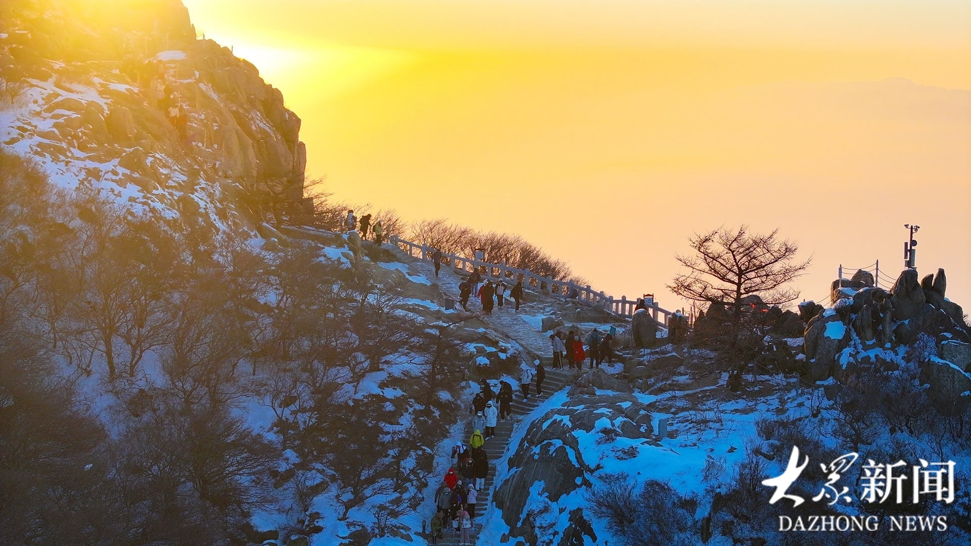 12月14日齐鲁大地雪后初晴泰山雄浑壮美金色阳光漫撒山峰白雪皑皑观日游客雪中古建崎岖山路相互映衬影色交融典雅壮丽构成一幅幅优美画卷大众新闻通讯员李建辉