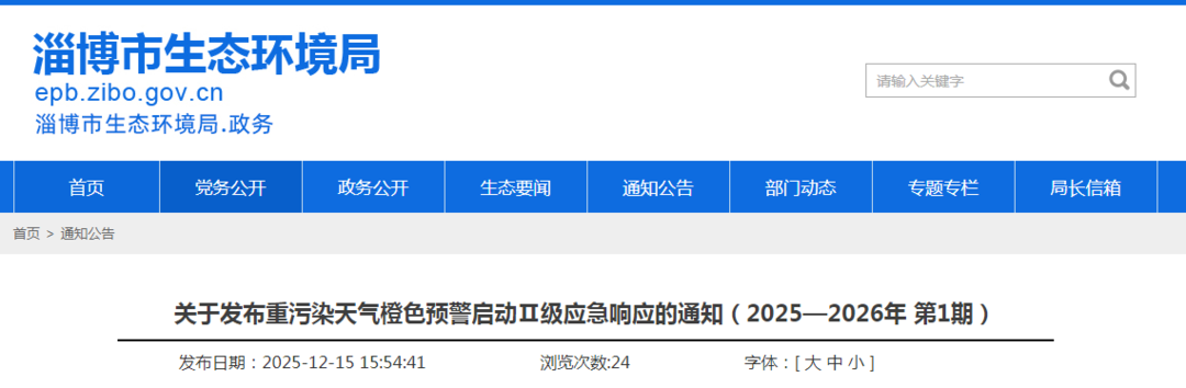12月15日,淄博市生态环境局关于发布重污染天气橙色预警启动Ⅱ级应急响应的通知。