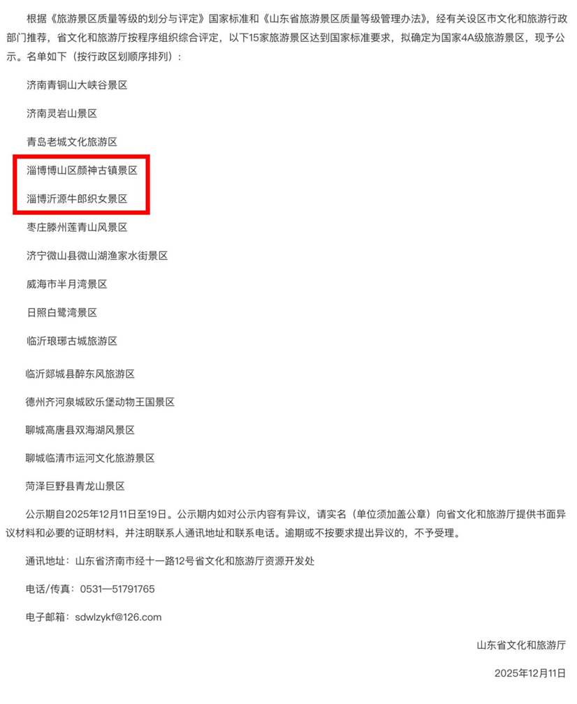 正在公示!淄博将新增两处国家4A级景区大众报业·齐鲁壹点 2025-12-15 18:33:29日前,山东省文化和旅游厅发布公示:拟确定15家旅游景区为国家4A级旅游景区,淄博博山区颜神古镇景区、淄博沂源牛郎织女景区成功上榜。大众新闻·齐鲁壹点 张晓光责任编辑:曲惠莹