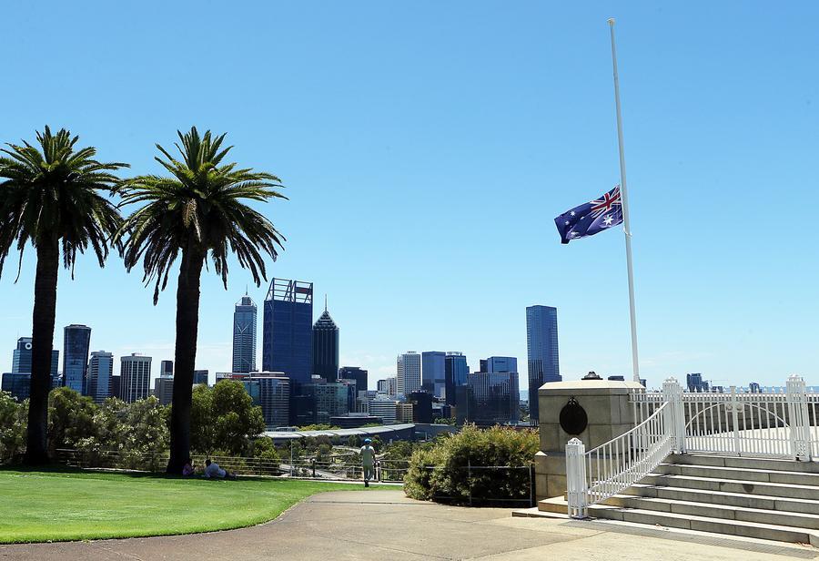 Australian national flag flies at half-mast at Kings Park in Perth, Australia, Dec. 15, 2025. (Photo by Zhou Dan/Xinhua)