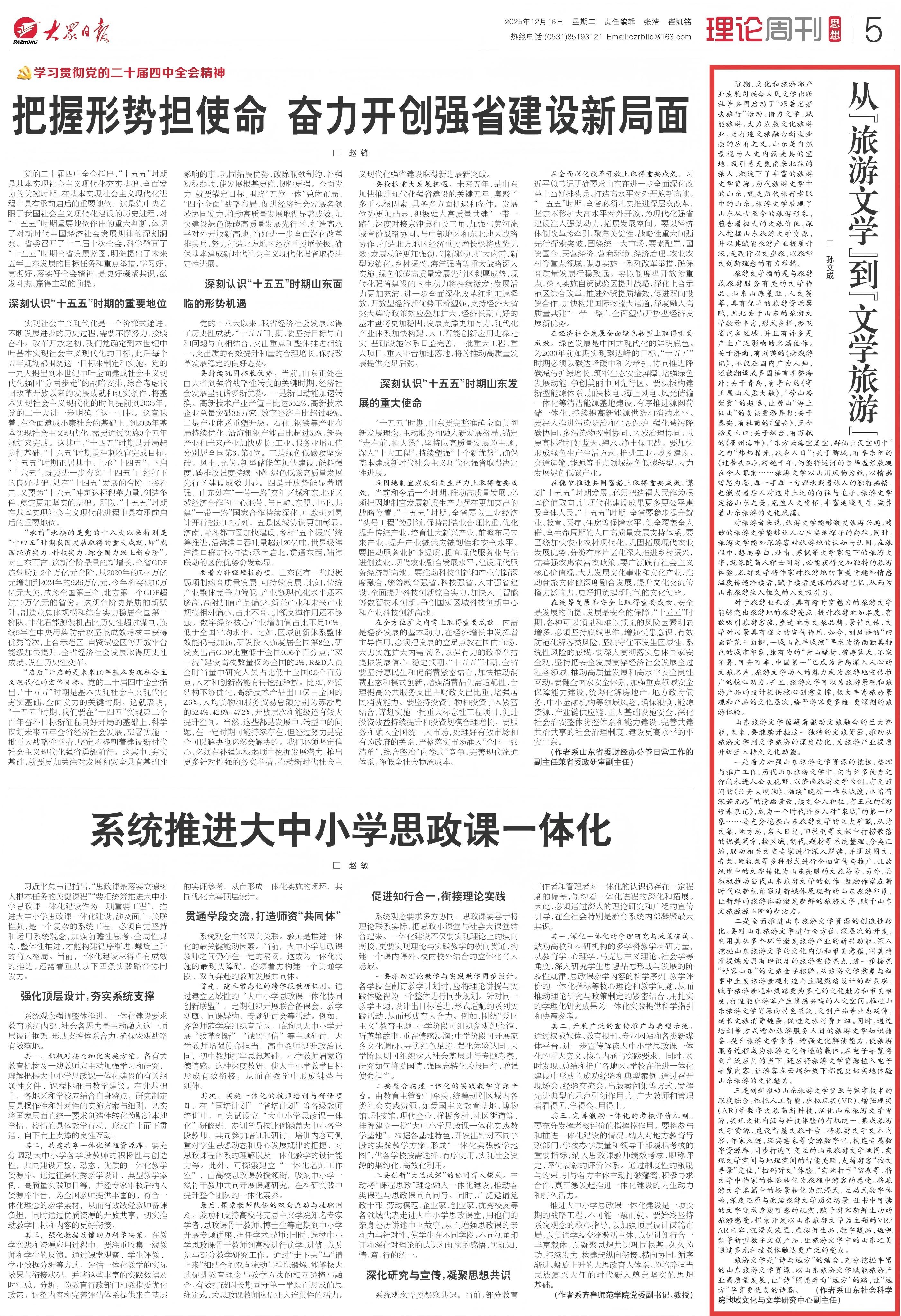 旅游文学是“诗与远方”的结合。充分挖掘丰富的山东旅游文学资源,以山东旅游文学赋能旅游产业高质量发展,让“诗”照亮奔向“远方”的路,让“远方”孕育更优美的诗篇。 (作者系山东社会科学院地域文化与文学研究中心副主任)