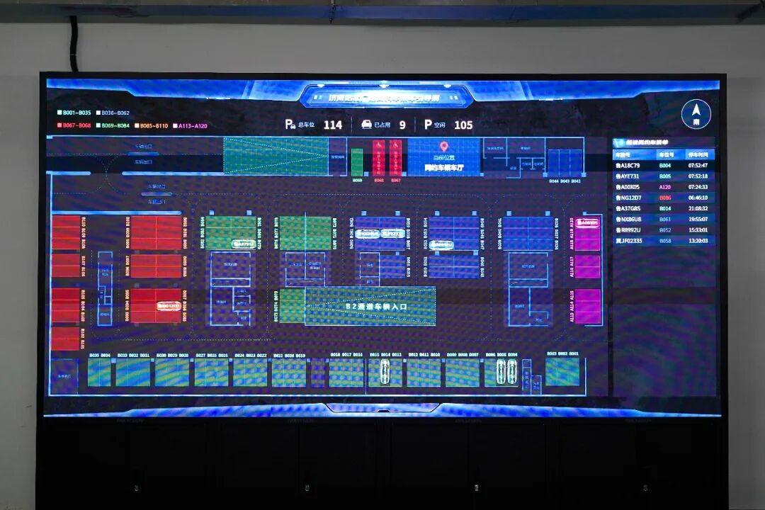 显示屏右侧设有动态信息栏,滚动展示已进场车辆的车牌与车位号。