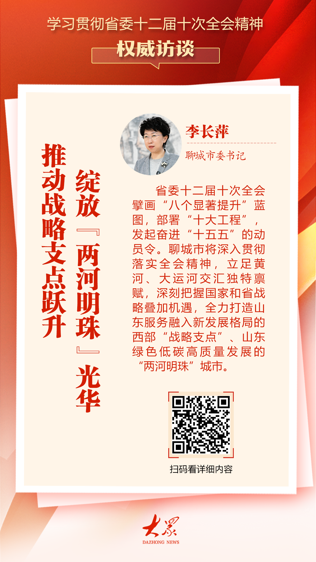 省委十二届十次全会擘画“八个显著提升”蓝图,部署“十大工程”,发起奋进“十五五”的动员令。聊城市将深入贯彻落实全会精神,立足黄河、大运河交汇独特禀赋,深刻把握国家和省战略叠加机遇,全力打造山东服务融入新发展格局的西部“战略支点”、山东绿色低碳高质量发展的“两河明珠”城市。