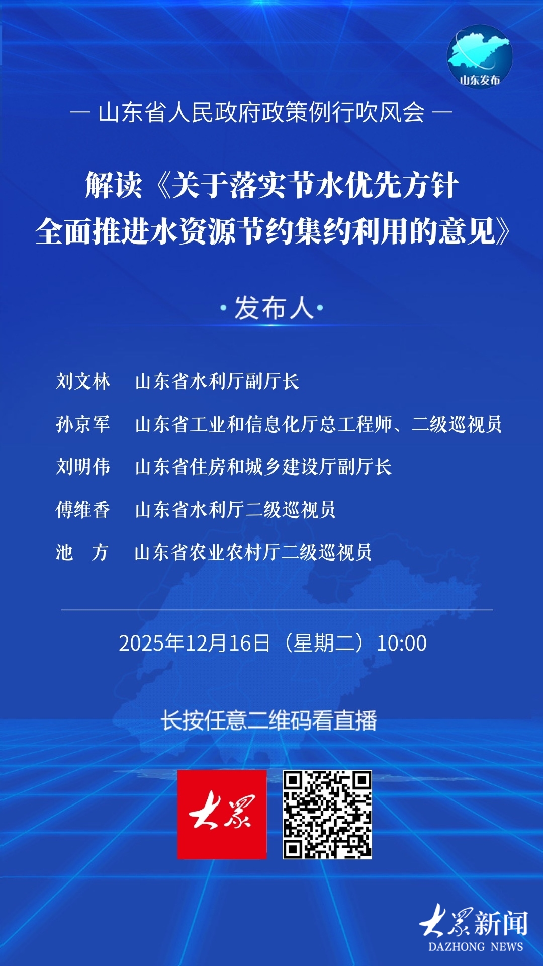 省政府新闻办定于12月16日周二上午1000举行省政府政策例行吹风会邀请省水利厅负责同志等解读山东省人民政府关于落实节水优先方针全面推进水资源节约集约利用的意见大众新闻记者崔晗申佳鑫