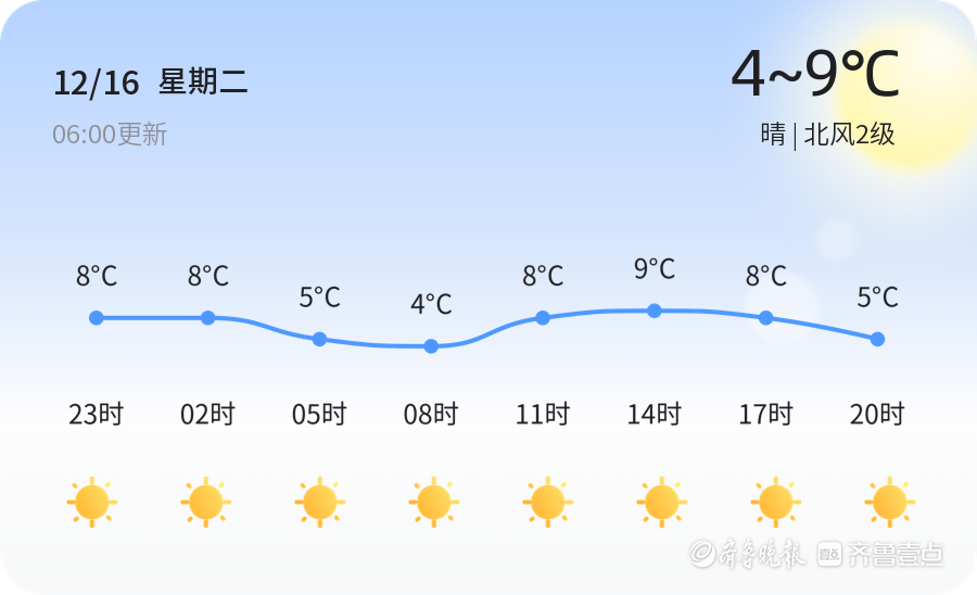 今天是12月16日,星期二,农历十月廿七。青岛市迎来晴朗天气,气温介于4℃到9℃之间,当前温度5.6℃。北风2级,空气湿度69%,PM2.5指数为70,属于良级,空气质量良好。市民可正常户外活动,但需注意保湿,避免皮肤干燥,同时注意用火用电安全。未来三天,青岛市天气持续晴朗,气温逐步上升。明天12月17日,气温将升至2℃到10℃,后天12月18日,气温维持在2℃到7℃之间。12月19日,天气转为多云,气温稍降,最低气温4℃,最高气温11℃。市民需关注气温变化,及时增减衣物,预防感冒。温馨提示