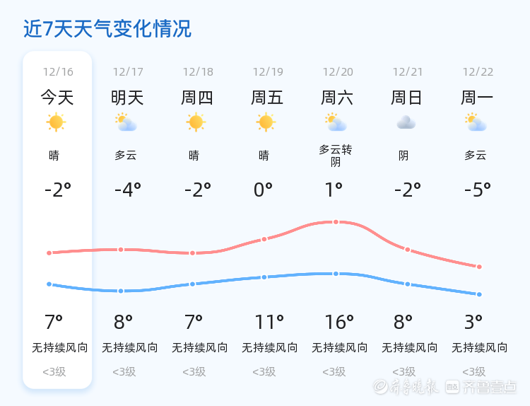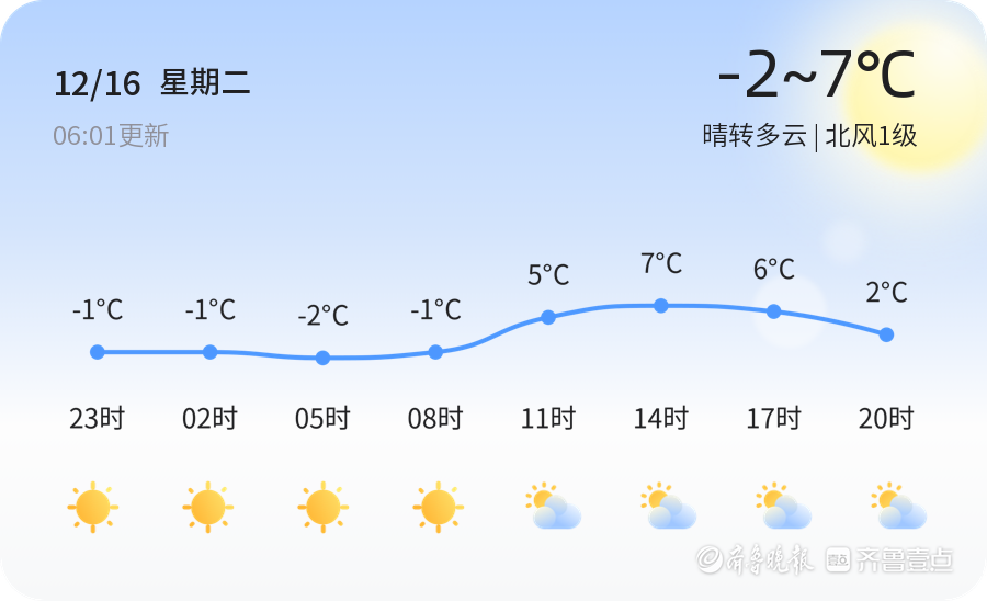 今天是12月16日,星期二,农历十月廿七。淄博市今日天气晴转多云,气温温和,最高气温7℃,最低气温-2℃。目前气温为-2.7℃,北风1级,空气湿度高达94%,PM2.5指数为98,空气质量良好。各区天气情况基本一致,均为晴转多云。