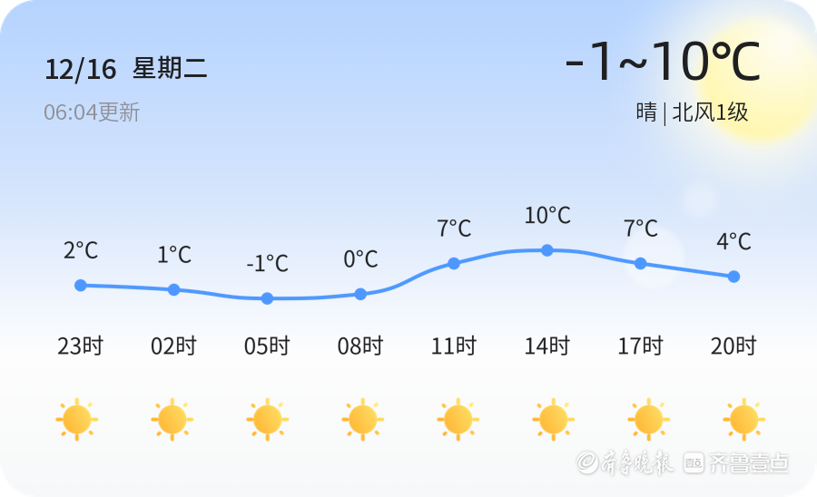 今天是2025年12月16日,星期二,农历十月廿七。济宁市今日天气晴朗,气温在-1℃到10℃之间,北风1级,空气湿度为93%。PM2.5指数为97,空气质量状况为良。市民在户外活动时,建议佩戴口罩,注意保暖,特别是早晨和傍晚,温度较低,需增添衣物。出行时请关注天气变化,保持安全距离,注意交通安全。