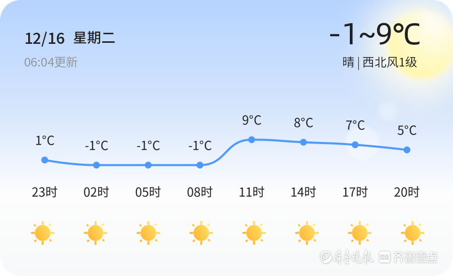 今日是农历十月廿七,泰安市迎来晴朗的一天。当前时间为6时04分,气温为-1.7℃,天气晴朗,西北风1级,空气湿度为96%,PM2.5指数为99。今日最高气温预计将达到9℃,最低气温为-1℃。各区天气情况总体平稳,以晴朗为主,风力较小,适合市民户外活动。
