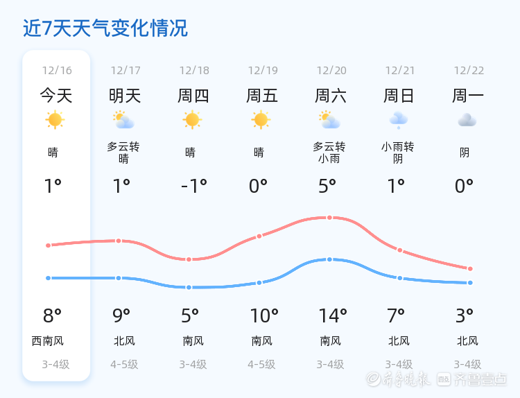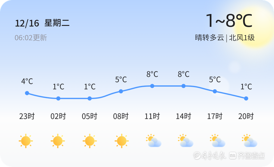 今天是12月16日,星期二,农历十月廿七。烟台市今日天气晴转多云,气温在1℃到8℃之间,北风1级,湿度62%,PM2.5指数69。各区天气情况总体平稳,市民出行适宜,但请注意保暖。