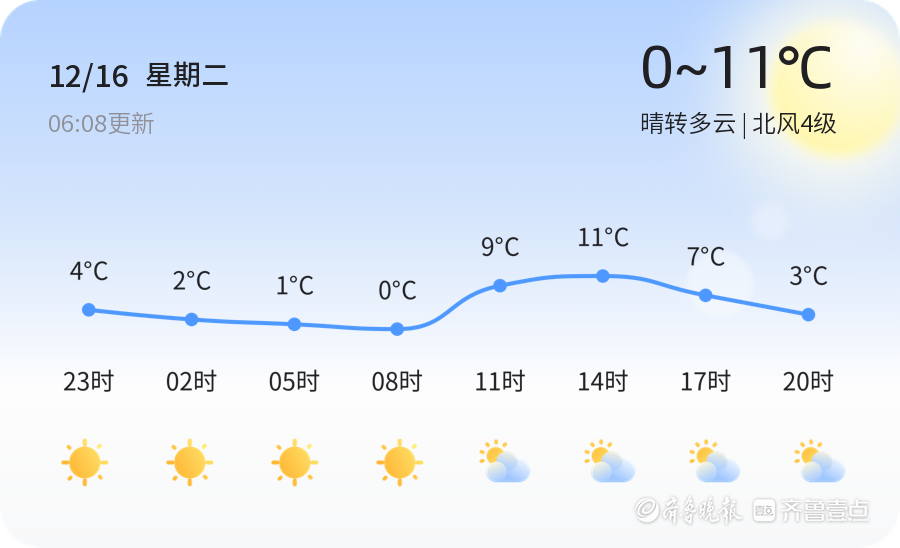 今天是12月16日,星期二,农历十月廿七。临沂市今天天气晴转多云,北风4级,温度在0℃至11℃之间。全市各区天气情况总体平稳,以晴到多云为主,市民出行需注意防风保暖。当前气温为1.6℃,湿度74%,PM2.5指数为108,空气质量良好。