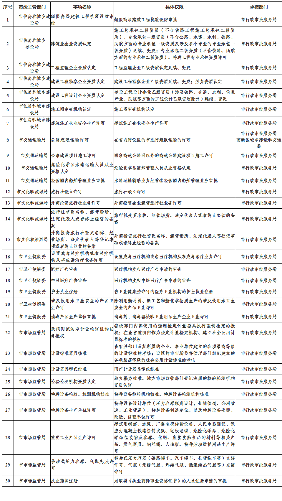 根据《中华人民共和国行政许可法》《中华人民共和国行政处罚法》《山东省行政程序规定》(省政府令第238号)、《山东省人民政府关于部分省级行政权力事项委托实施的决定》(省政府令第368号)等有关法律法规、规章的规定,自2025年12月15日起,济宁市行政审批服务局承接实施超限高层建筑工程抗震设防审批、建筑业企业资质认定、工程监理企业资质认定等28项省级行政权力事项。