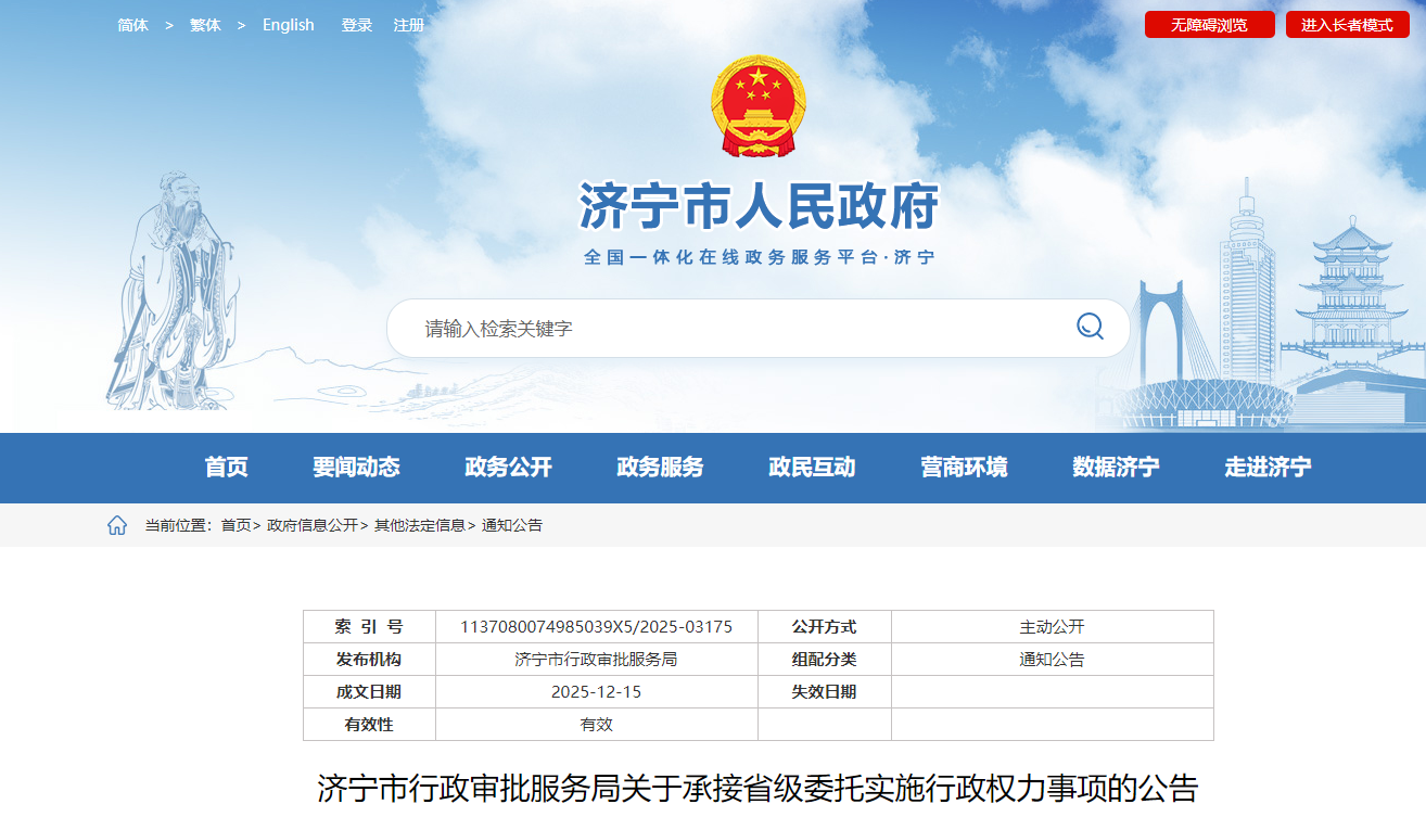 济宁市行政审批服务局关于承接省级委托实施行政权力事项的公告