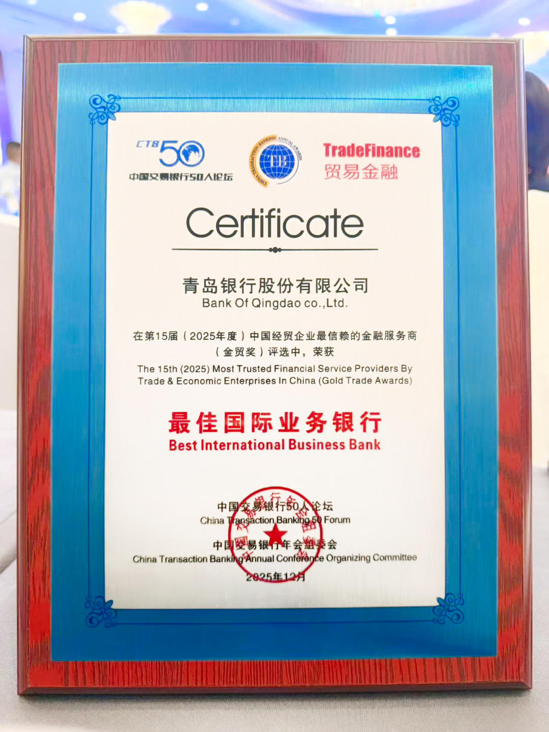 12月12日,在第15届中国经贸企业最信赖的金融服务商(金贸奖)评选中,青岛银行脱颖而出,获评“最佳国际业务银行”。该行是首家获此殊荣的地方法人银行,彰显了其在国际业务领域的创新实力与市场认可。