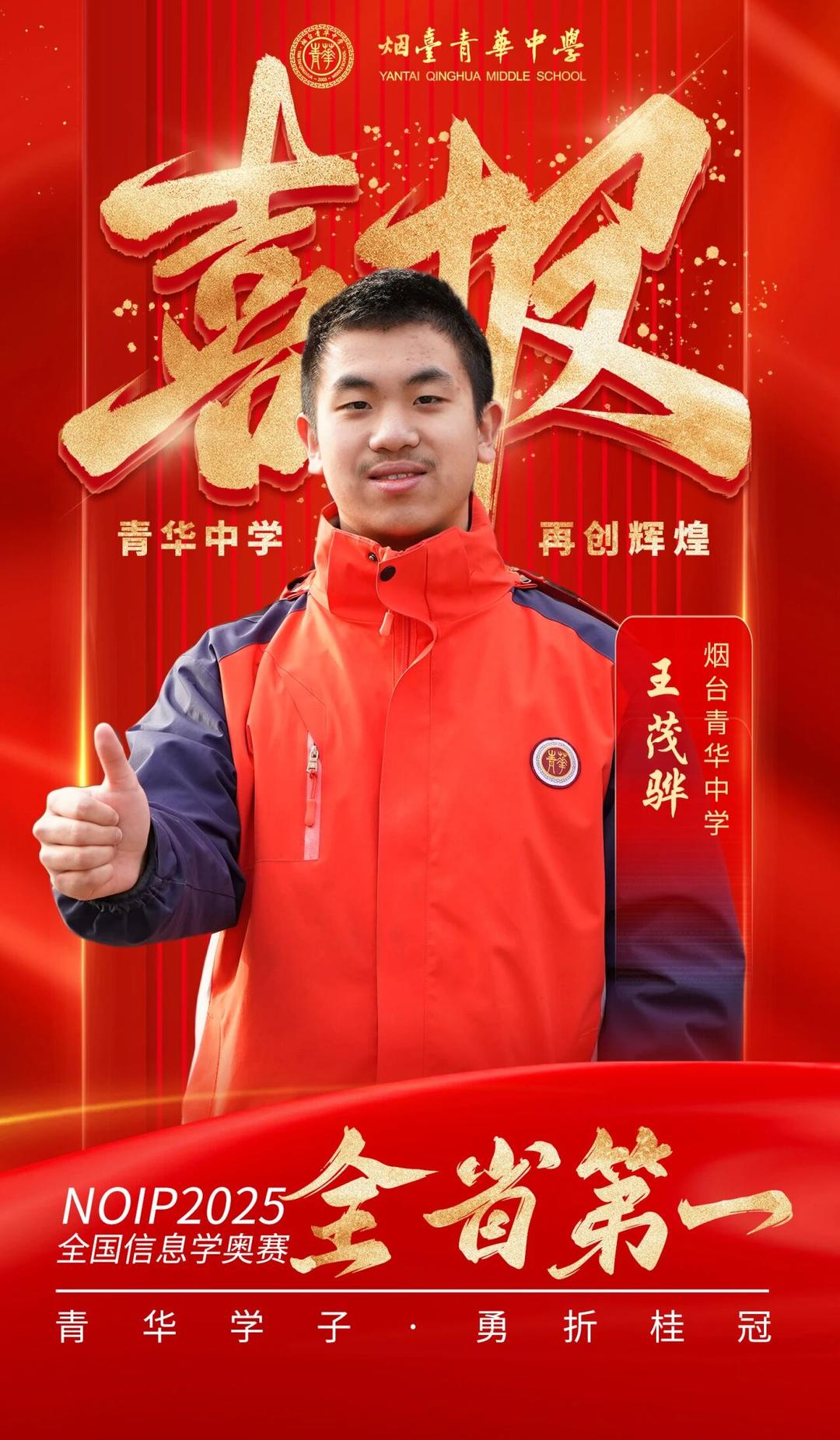 12月15日,从烟台青华中学获悉,在近期举办的全国青少年信息学奥林匹克联赛(NOIP)中,该校学子锐意进取,再创佳绩。高一王茂骅同学在本届比赛中再次勇夺全省第一。这也是青华中学学子连续三年获得此项大赛山东省第一名。