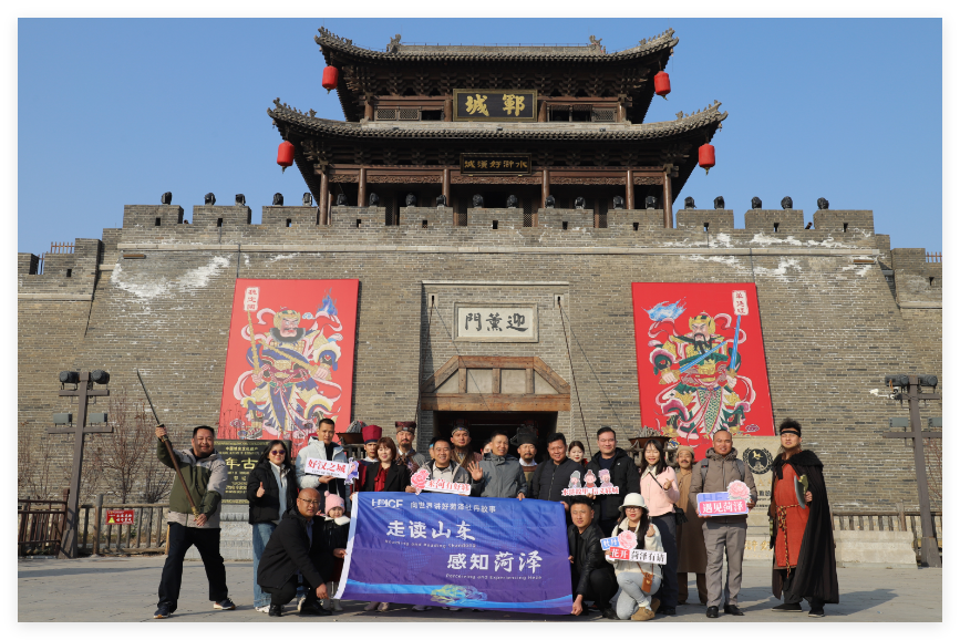 作为“武术之乡”“戏曲之乡”“书画之乡”,郓城依托深厚文化底蕴,打造“一城一郓(韵)”国际传播品牌,通过“走读山东”等系列活动,让世界各地友人在互动体验中读懂中国。刚抵达景区门口,身着古装的演职人员便拱手抱拳行迎宾之礼,铿锵锣鼓声中,习武之人手持器械轮番上阵,刚劲有力的招式引得越南友人频频鼓掌叫好。“好汉迎宾酒”环节,友人们端起大碗米酒一饮而尽,随后潇洒摔碗,沉浸式感受豪迈气概,纷纷与演员合影定格欢乐瞬间。