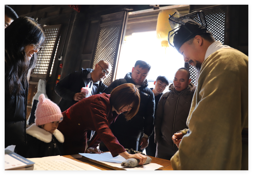 如果说武术表演展现的是中华儿女的刚健风骨,非遗体验则传递着传统文化的细腻匠心。在活字印刷体验区,越南友人阮黄芳认真聆听非遗传承人的指导,亲手涂墨、覆纸、轻刷,看着一个个汉字在宣纸上清晰显现,脸上洋溢着喜悦与成就感,当场将自制的带字纸张小心翼翼收好,作为此次郓城之行的珍贵纪念。非遗曲艺大鼓书表演者指尖翻飞,鼓板轻响,悠扬唱腔萦绕耳畔,友人们沉浸其中,不时点头附和,感受传统曲艺的独特魅力。