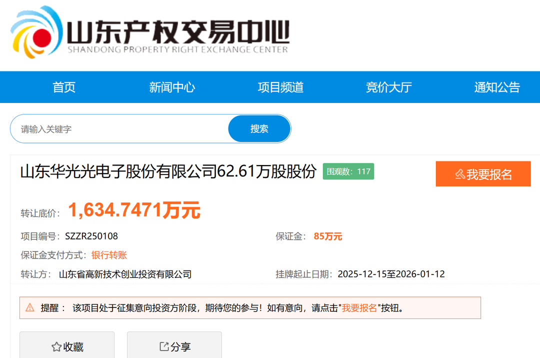 山东产权交易中心信息显示,山东华光光电子股份有限公司(下称“山东华光光电子”)62.61万股股份转让项目正在挂牌,转让底价为1634.75万元,转让方为山东省高新技术创业投资有限公司(下称“山东高新创投”),挂牌起止日期为2025年12月15日至2026年1月12日。