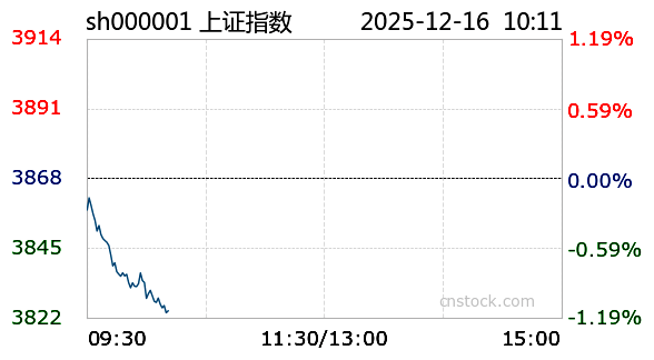 AI小壹12月16日讯 沪市小幅下跌,最高触及3862.43点,最低下探3823.55点,振幅-1.12%。截至10:00,上证指数低开3824.49点,跌幅1.12%,成交额2941.37亿元,成交量2.14亿;深证成指报12958.35点,最高13113.99点,最低12955.79点,跌幅1.17%,成交额3896.55亿元,成交量2.77亿创业板报3100.0点,最高3141.58点,最低3092.49点,跌幅1.2%,成交额1733.87亿元,成交量7617.42万